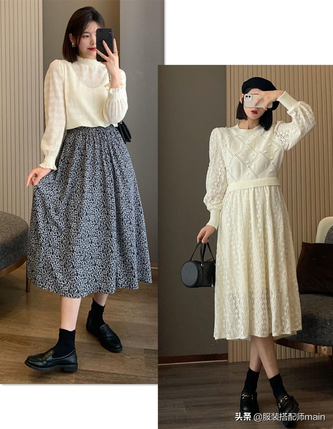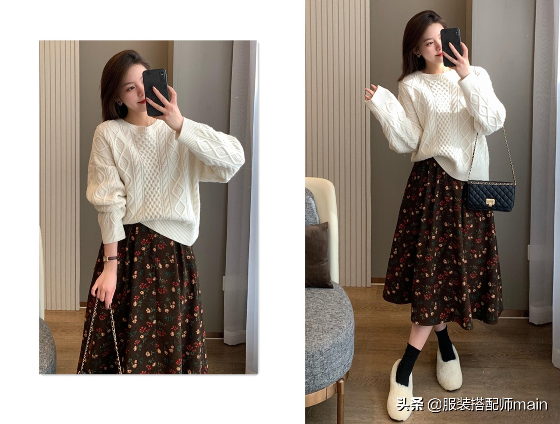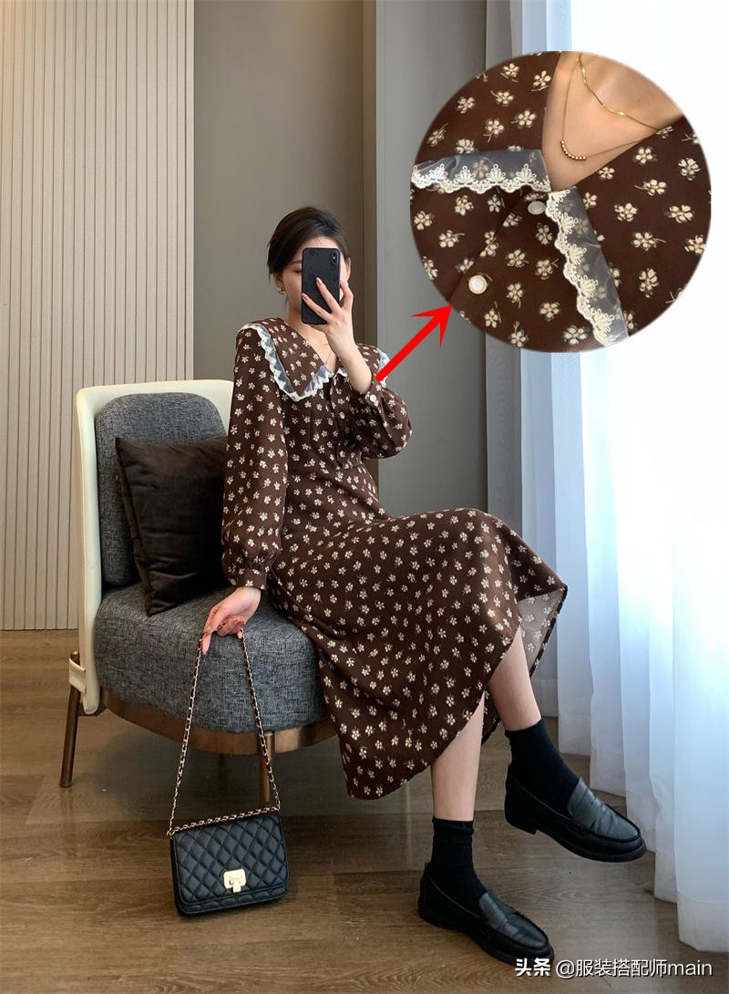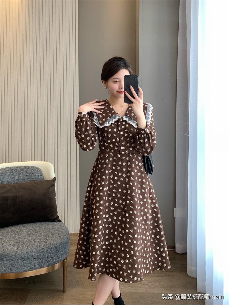 這條深色的碎花半身裙就十分適合現在穿了,雖然是深色也不怕,搭件白毛衣不就行了,「上淺下深」的穿法沒毛病。