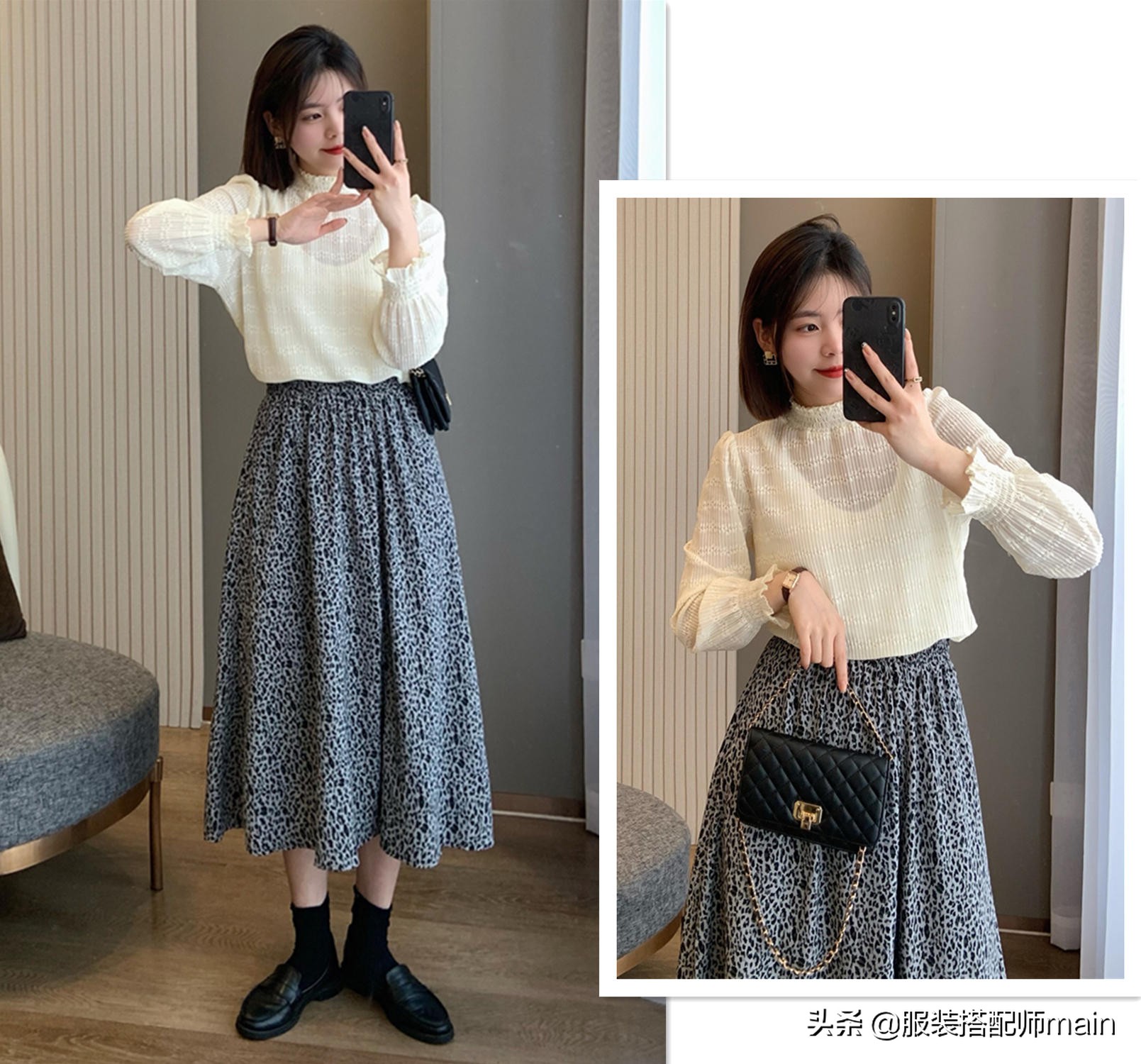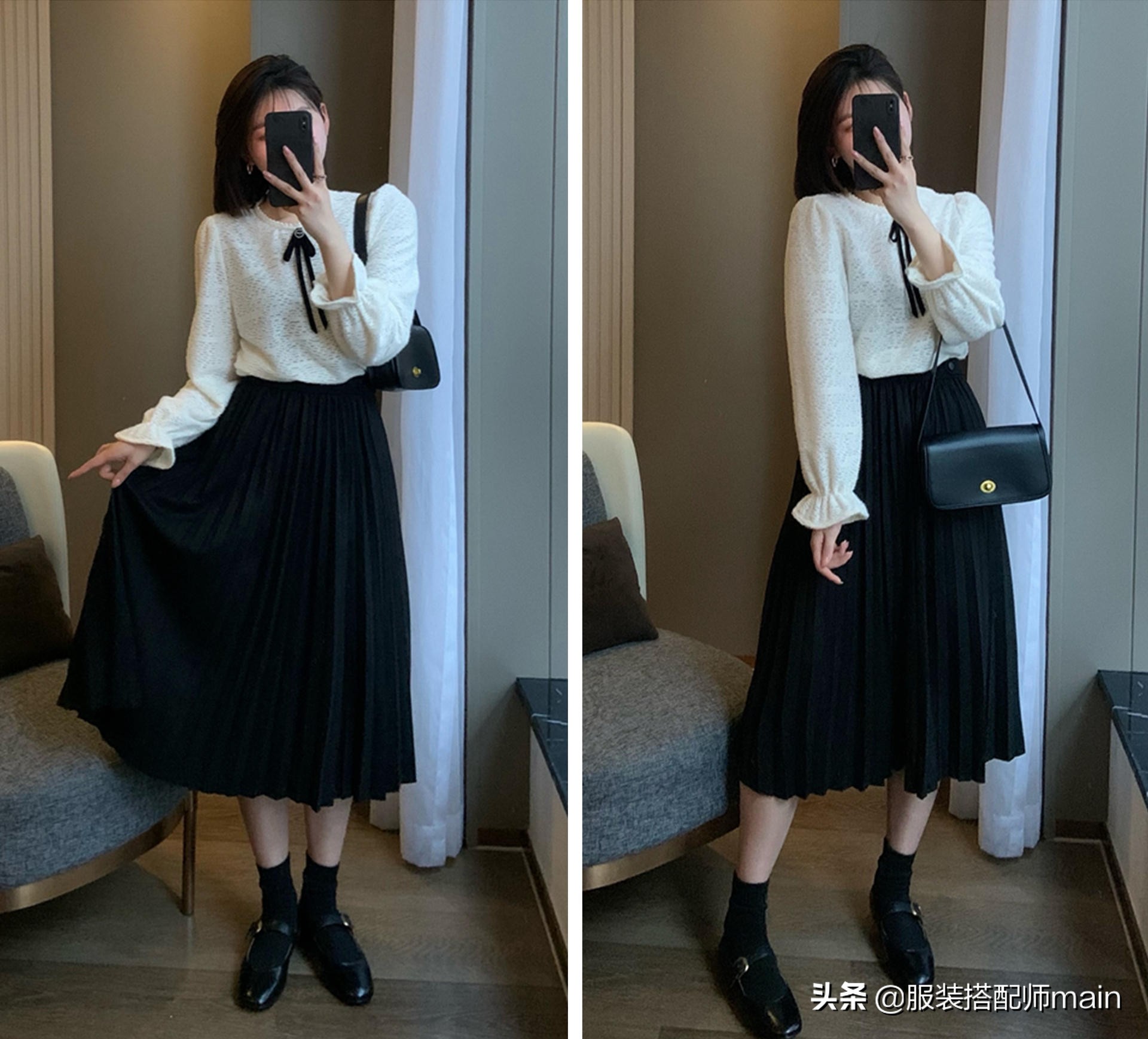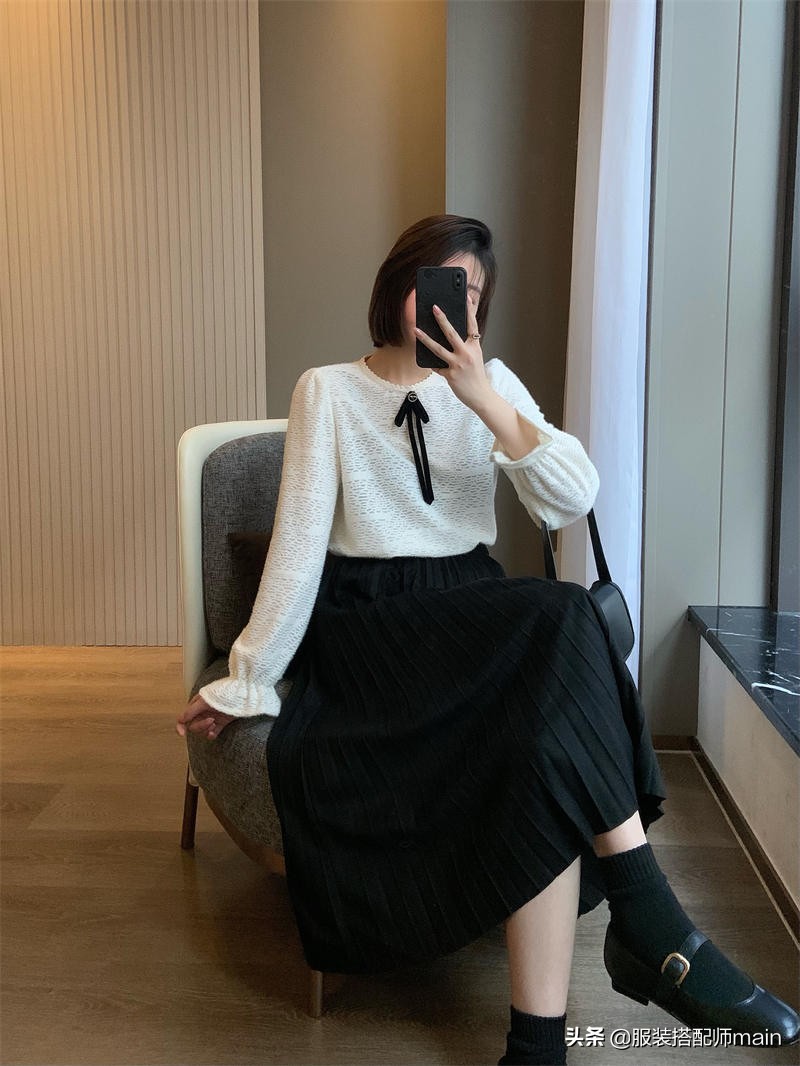 還是「黑白配」最經典,下裝一條黑色百褶裙,減齡效果也蠻出乎意料的嘛!