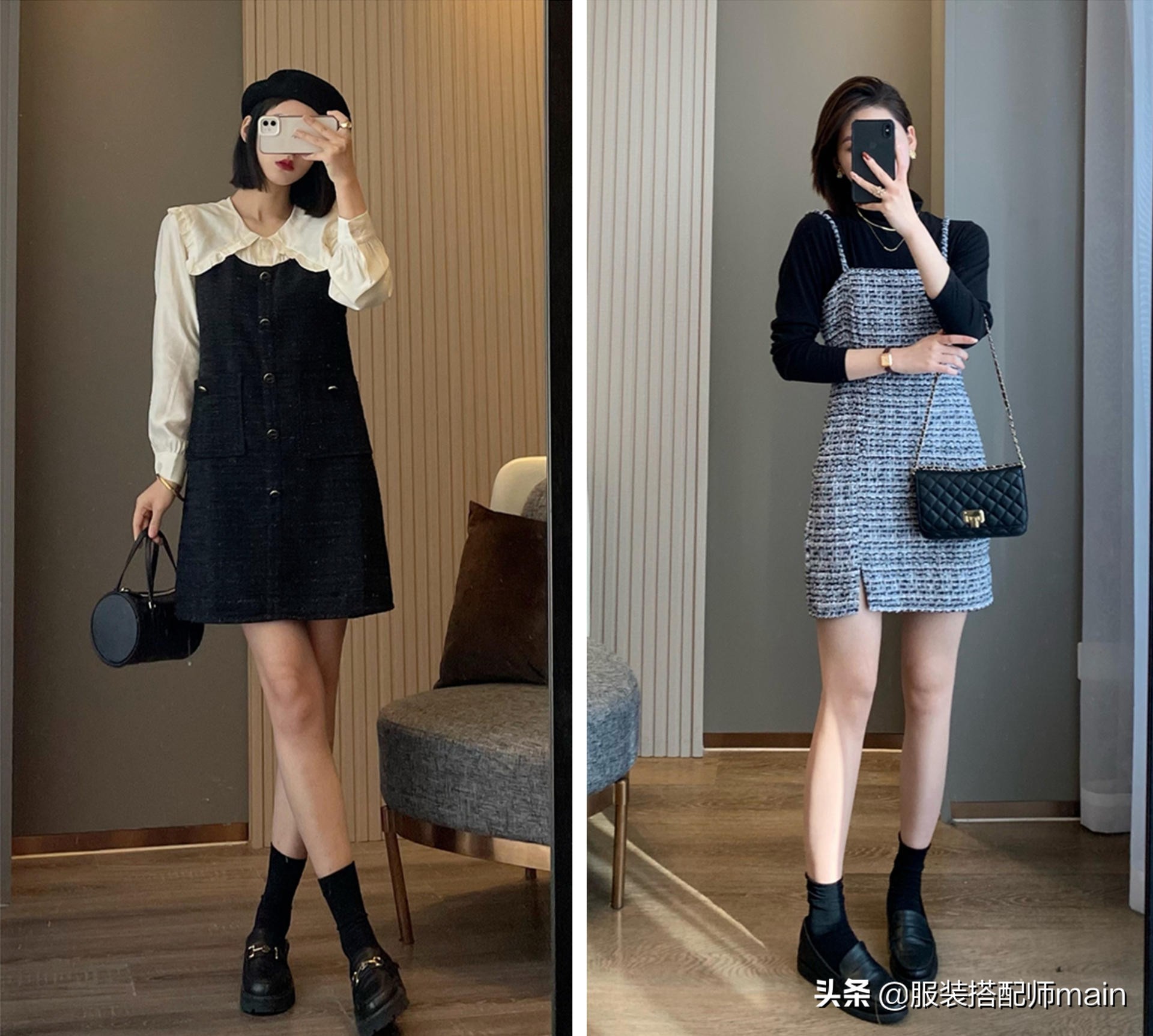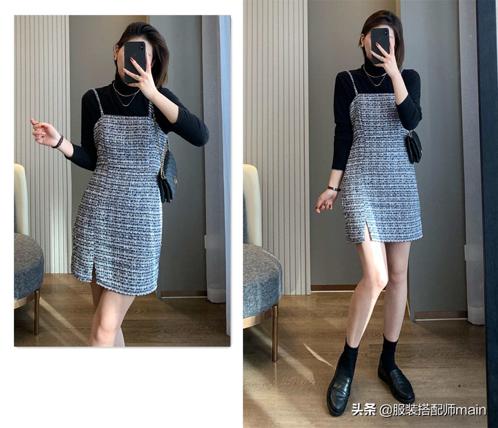 就像前面說的小香風並不只有一種風格,它也能很性感,不如這件小香風的吊帶裙,裙擺上的小開叉真的太性感了!