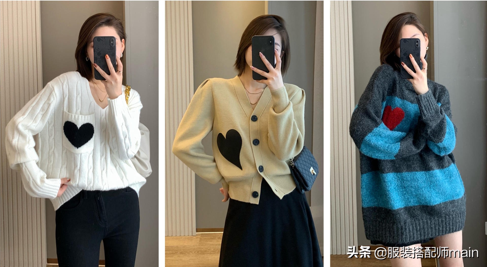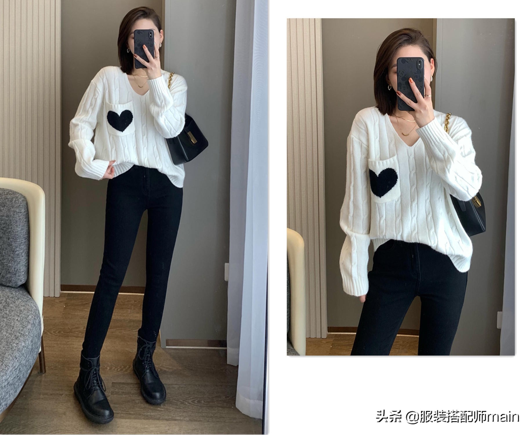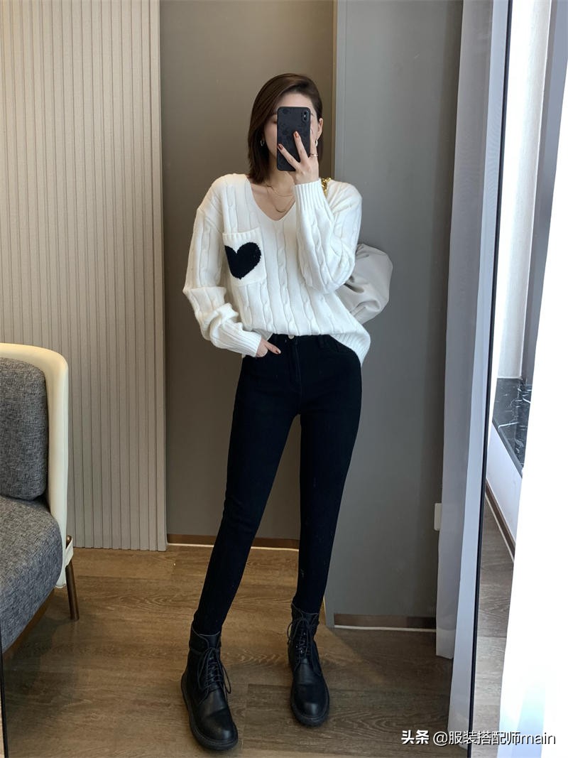大V領的白毛衣,優先展示出你迷人的鎖骨和天鵝頸,一側的口袋上點綴一顆愛心,在黑白撞色下格外顯眼!