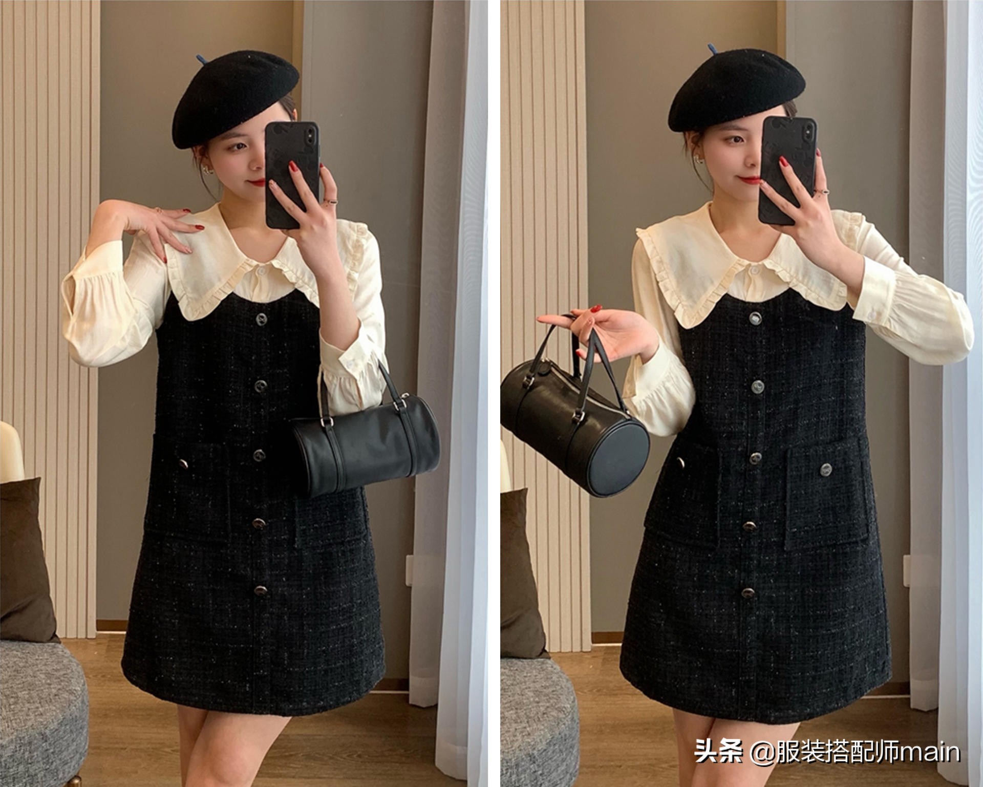 只要喜歡甜美風格的女生一定會喜歡這件假兩件的小香風連衣裙。木耳邊大方領和燈籠袖都是少女風的標配。