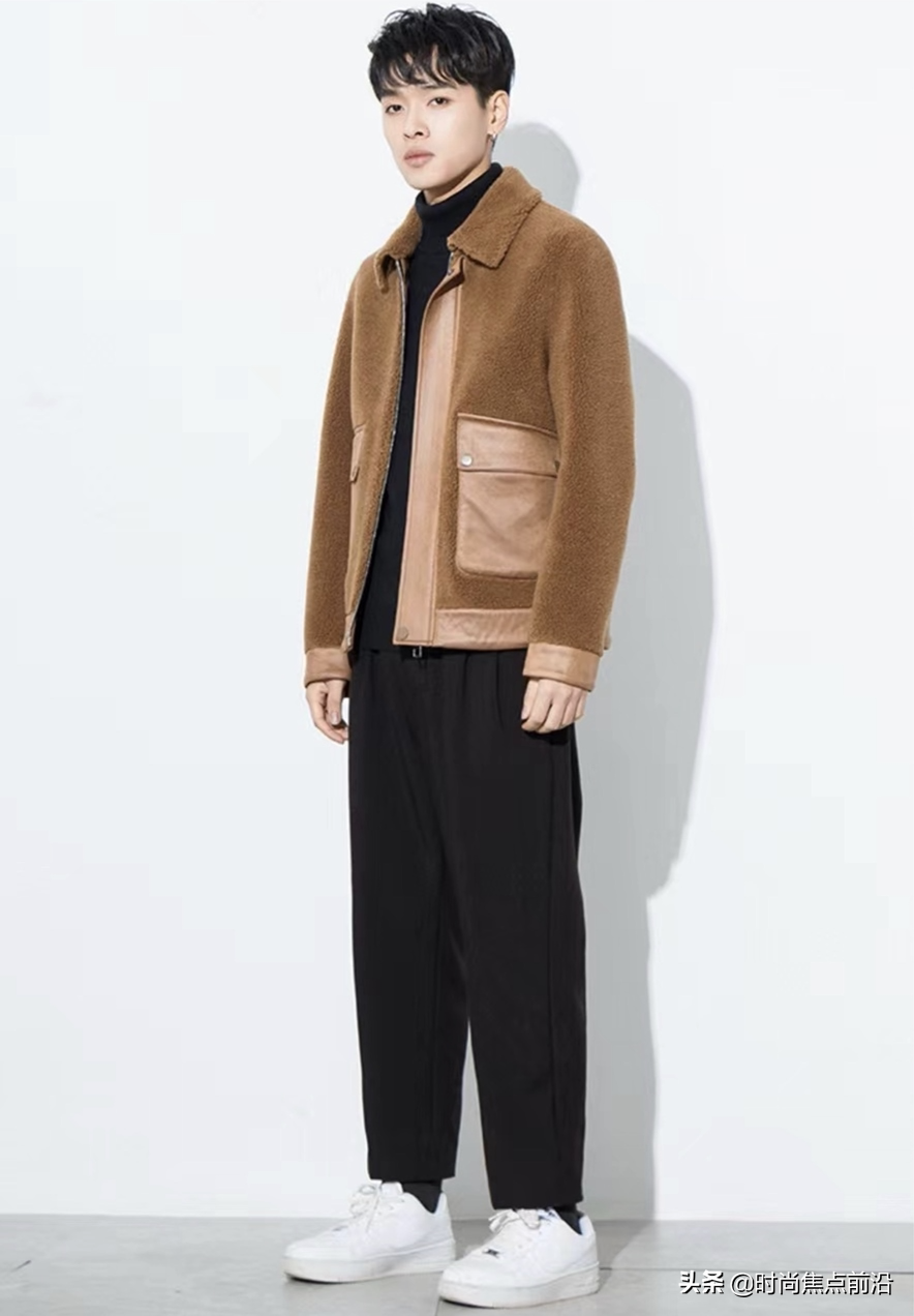 羊羔絨外套這幾年也非常的流行,裡外加絨手感柔軟,毛絨絨的感覺暖意融融,一般設計上來說男士的外套都比較簡約,不怎麼挑年齡。整體版型比較利落,搭配毛呢褲,時尚新潮。圖中摩登感的咖啡色和黑色打底衫和毛呢褲,整體身材顯得挺拔立體。