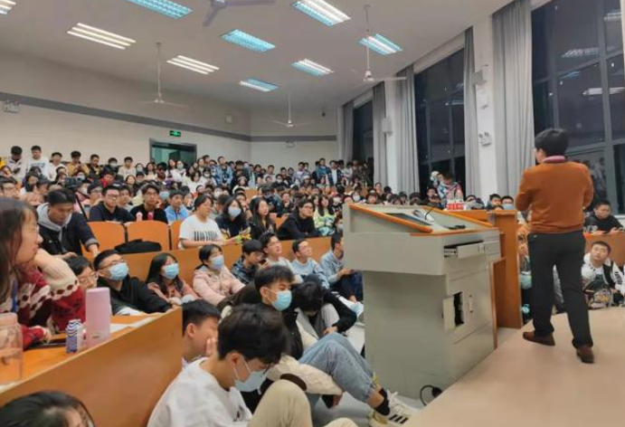 前來聽課的學生已經坐滿,沒有座位的同學寧願站著聽課,還有些人擠不進教室就坐在窗戶上,其餘同學站在教室窗外踮腳仰頭聽聲音,只為來學習知(戀)識(愛)。