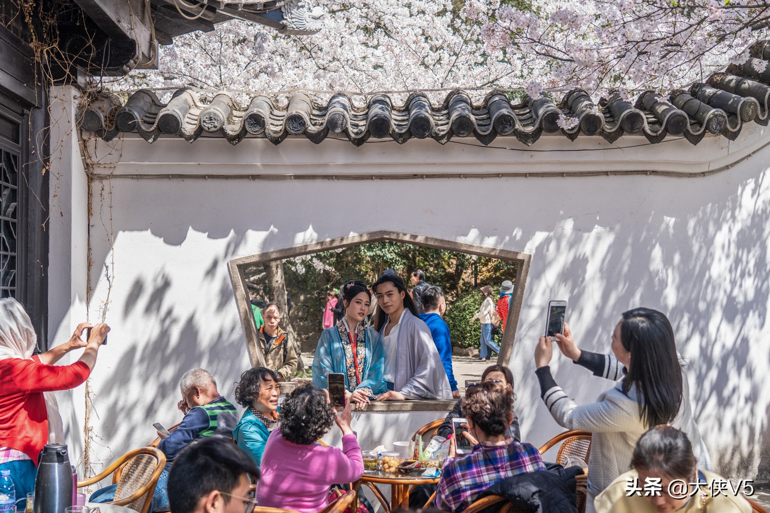 特別喜歡的一張情侶合照,事實上在長春橋附近有很多這樣的門窗可以利用框架來構圖,拍出別有意境的照片。拍累了,坐在櫻花樹下喝茶也是極美的。