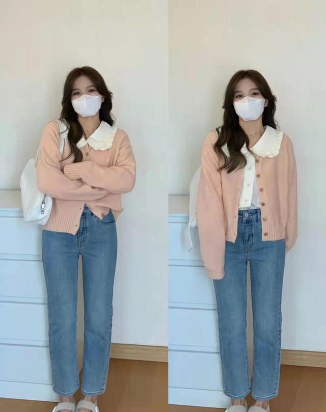 對於桃粉色的針織衫採用疊穿的方式當作外套進行搭配,即時髦又俏皮,顯得整個人很年輕,有一種青春活力。