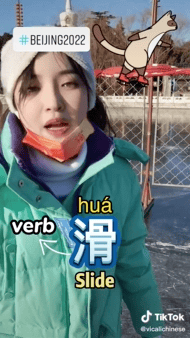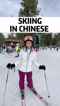 漢語教學博主Mia在TikTok上擁有31.8萬粉絲。在一段視訊中,她站在滑雪場邊,對著鏡頭講解Skiing在漢語中的發音,然後親身示范,在雪道上滑行。
