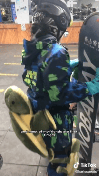 在這段視訊中,Karrisa和朋友在更衣室裡穿戴防護用具的場景引人註目。她介紹道,這是最近雪場裡最流行的防護神器,愛好者們叫它「小烏龜」,特別抗摔,又可愛又實用,廣受滑雪新手們喜愛,也引起外國網友圍觀。