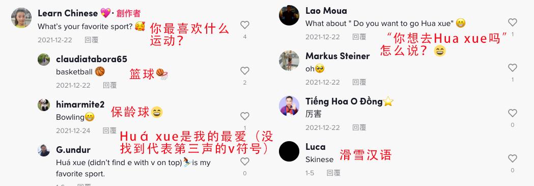 在Mia的評論區中,有網友摸索著打出「滑雪」的拼音,並據此造句,「Hua xue是我的最愛。」還有粉絲迫不及待地提問,「「你想去滑雪嗎」應該怎麼說?」