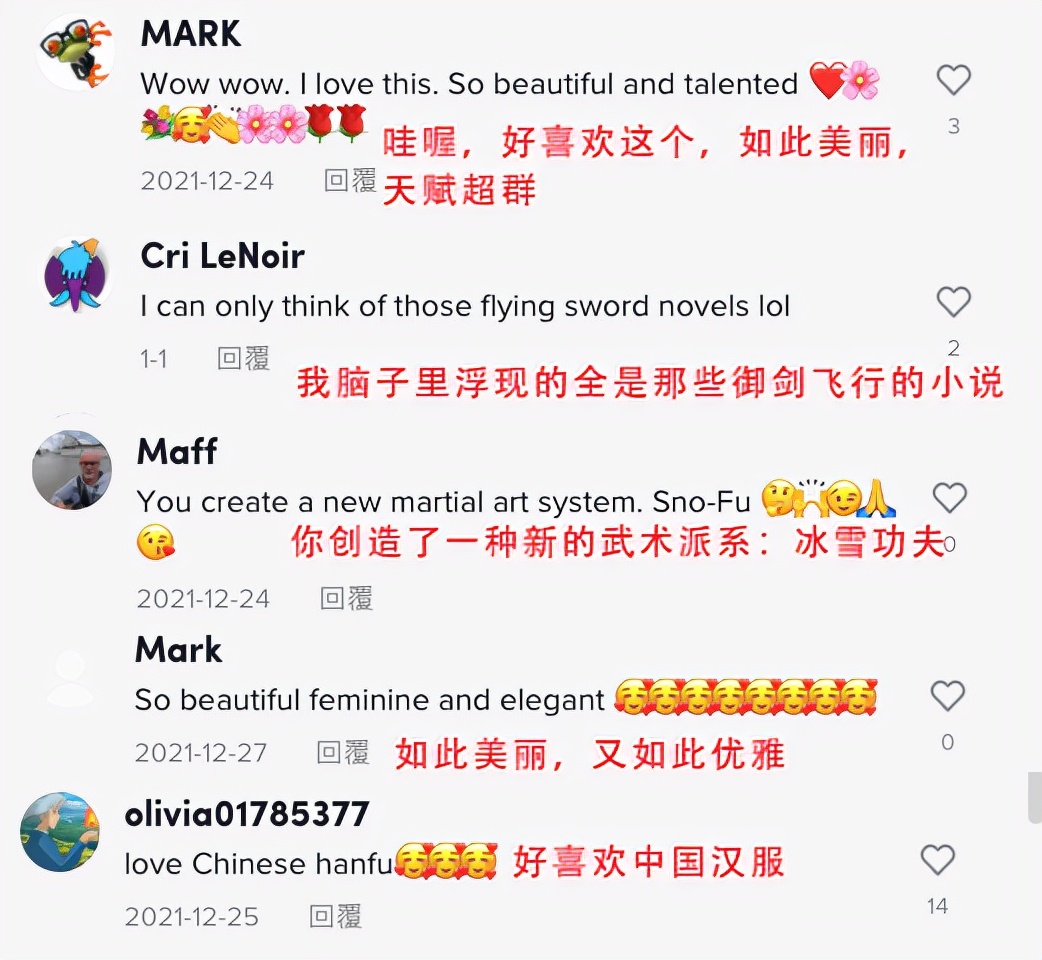 評論裡,能看到不同國家的網友豎起大拇指,用不同的語言表達對漢服和大陸美景的濃厚興趣。有人表示,視訊讓他想起那些禦劍飛行的武俠小說。網友@Maff稱讚道,這位大陸女孩創造了一種新的武術派系:Sno-Fu,意即「冰雪功夫」。