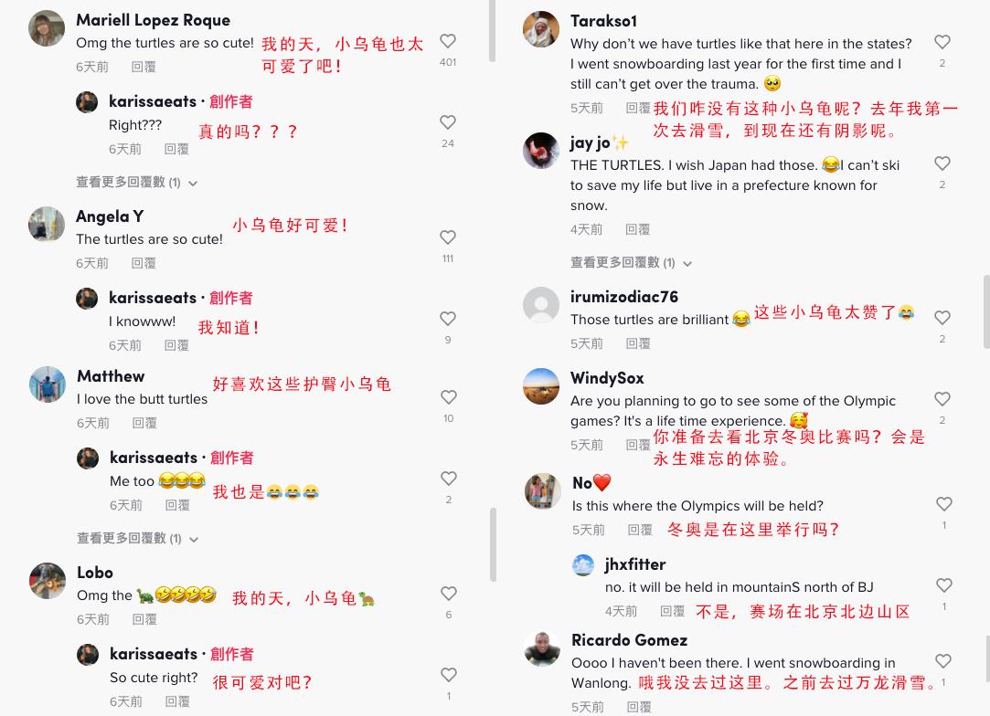 他們在Karrisa的評論區留言,「我的天,小烏龜也太可愛了吧!」「我們這裡怎麼沒有這種小烏龜呢?去年我第一次去滑雪,到現在還有陰影呢。」還有網友在評論區詢問Karrisa,是否會去觀看北京冬奧比賽,那將是「永生難忘的體驗」。