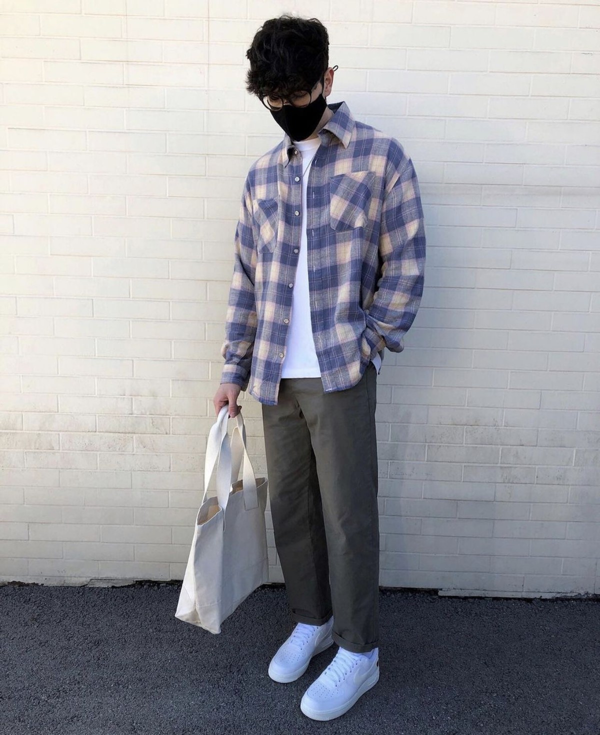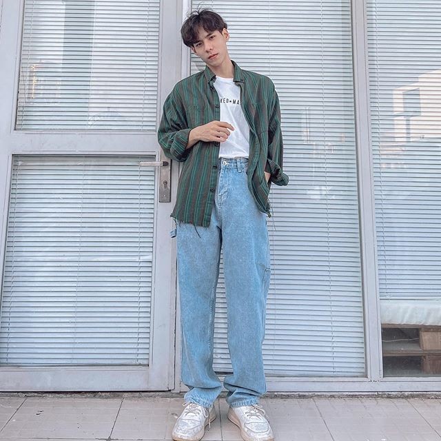 因為格紋襯衫本身色彩圖案就很豐富,所以,根據「繁簡結合」穿搭原則,格紋襯衫當成外套穿時,應該搭配簡約內搭單品,例如白色T恤。