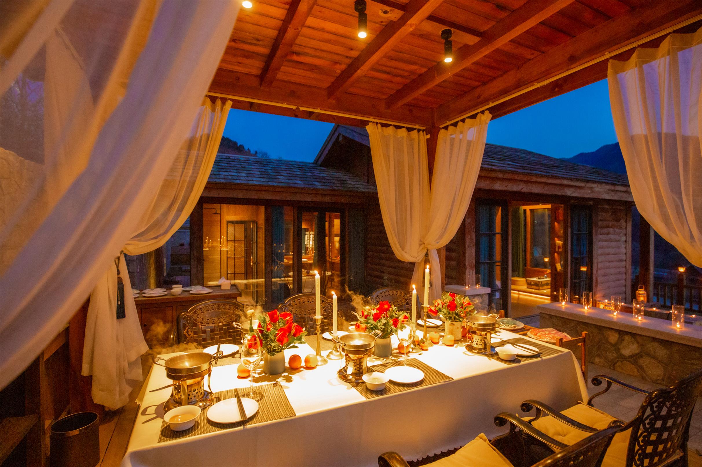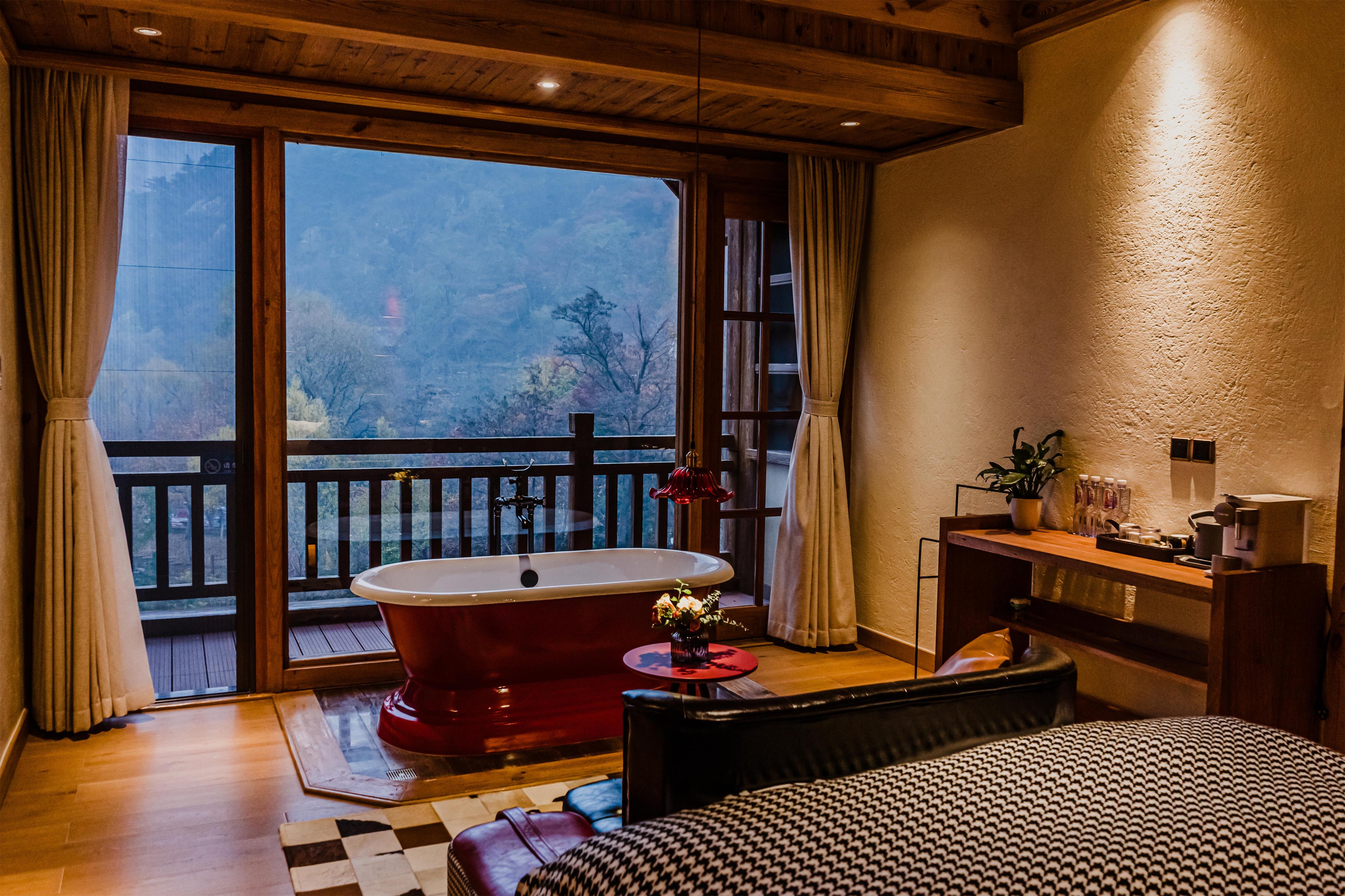 住進伴山別墅-閱木山居,享受獨立院落,落地大窗的設計,可以很好的與大自然溝通,薄暮伴著晚霞,當爐火燃起,兩個人一起燒烤、煮火鍋,和天空一起美餐一頓