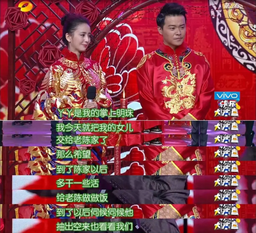 連父母也會配合這樣的「爹味」時刻,佟麗婭的父親就在《快樂大本營》上有過這樣一段發言:「我今天就把我的女兒,交給老陳家了,希望到了老陳家以後,多幹些活……」那是2014年年末,節目組為佟麗婭和陳思成補辦了一場中式婚禮,佟麗婭父親的這番話,也同樣引起過阿湯的不適。