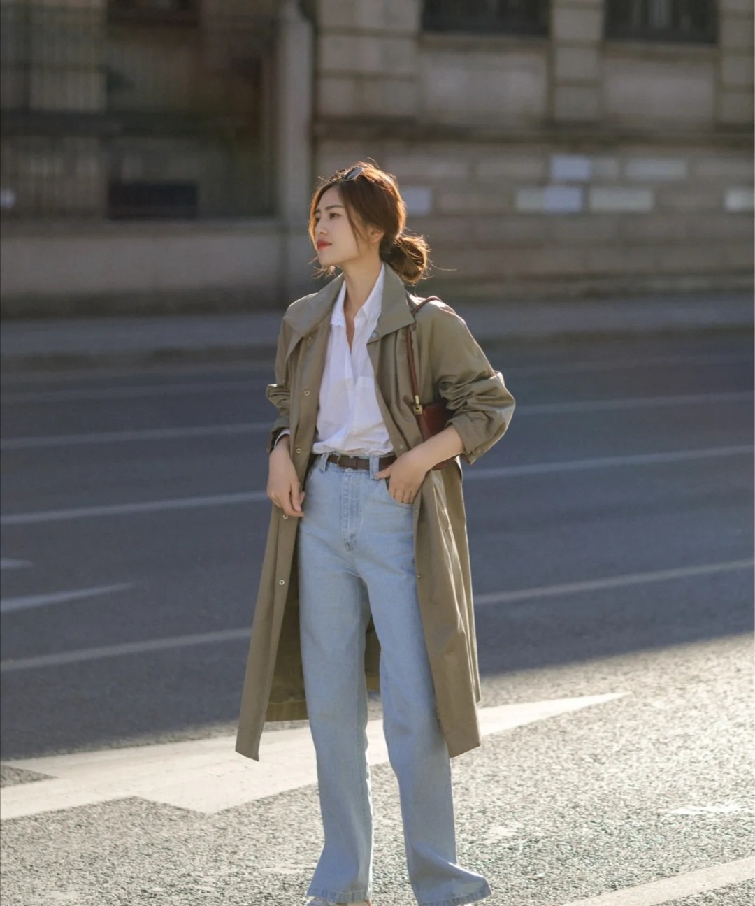 採取長款風衣和藍色牛仔褲的配合,也是很多人比較青睞的穿搭方式,風衣營造出灑脫的韻味,牛仔褲加入了減齡隨性的風采,直接收獲大氣感。