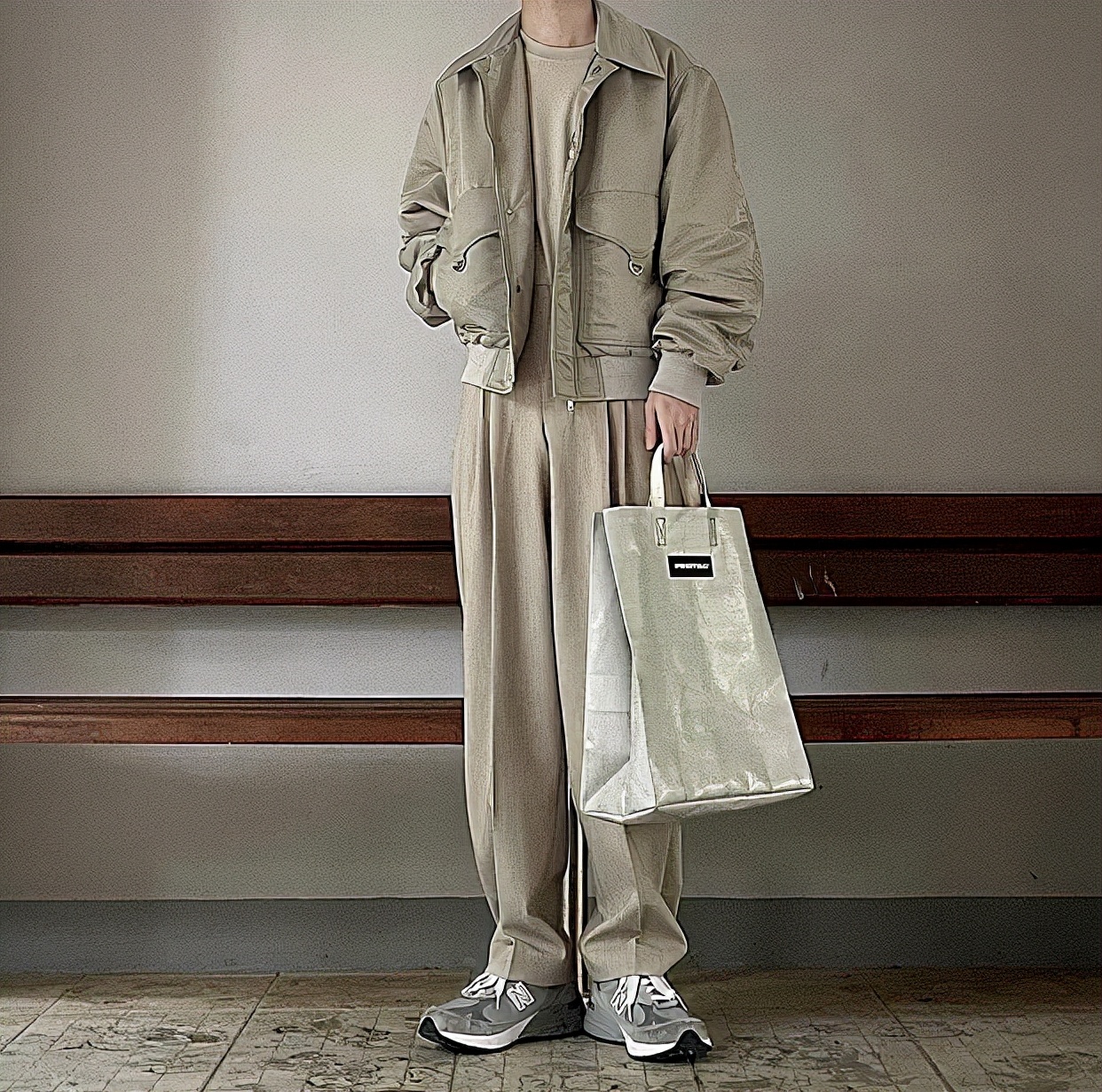 2.米色短款夾克 + 杏色闊腿褲 + NB運動鞋