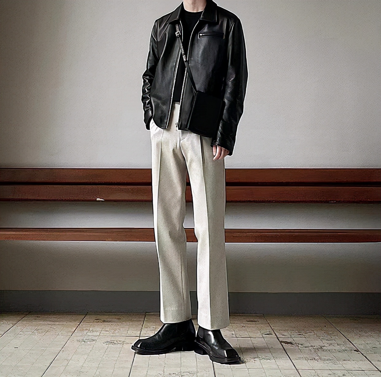 3.黑色皮衣 + 米色西褲 + 皮鞋