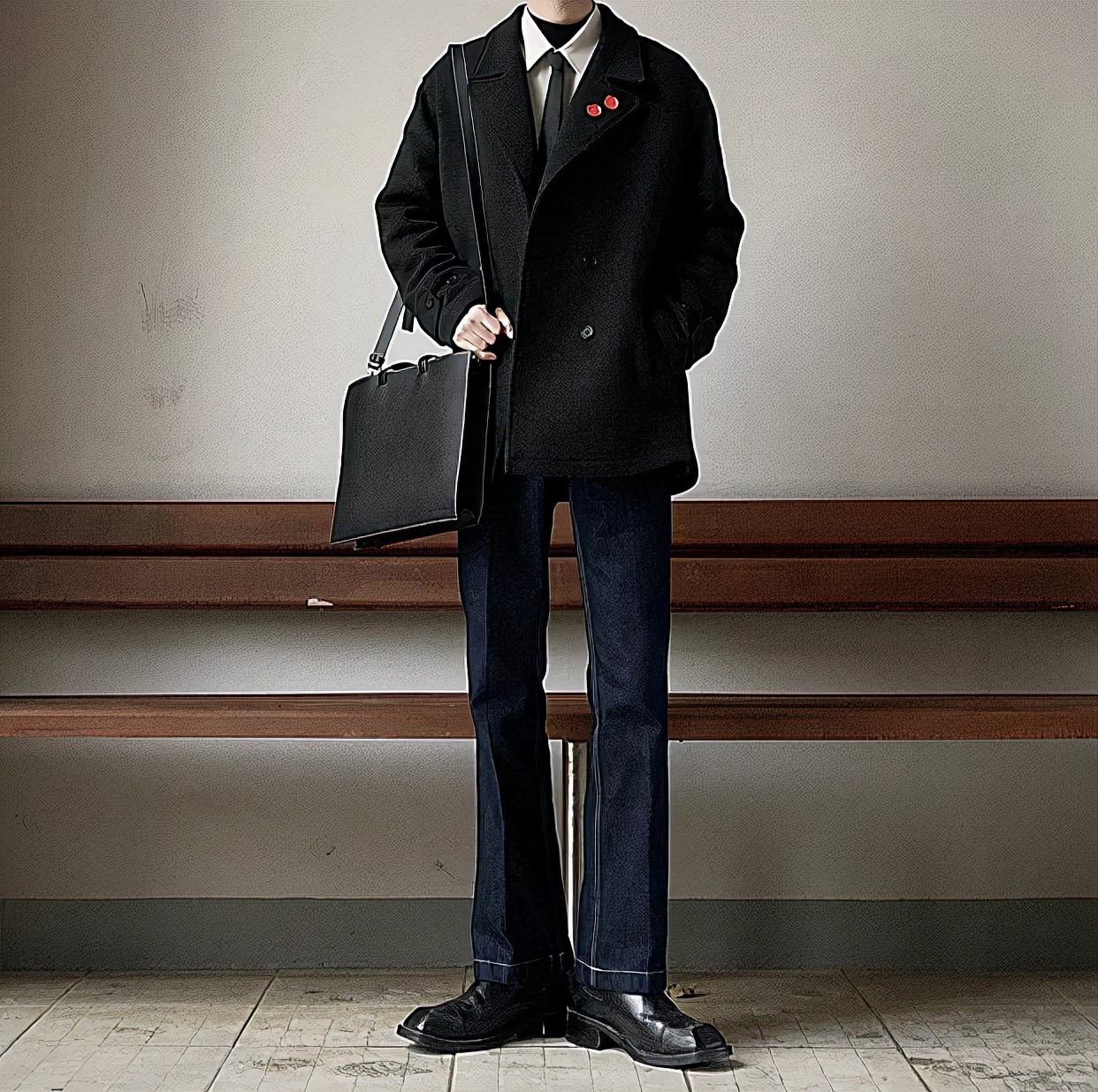 1.個性黑色毛呢西服 + 深藍色牛仔褲 + 高級皮鞋