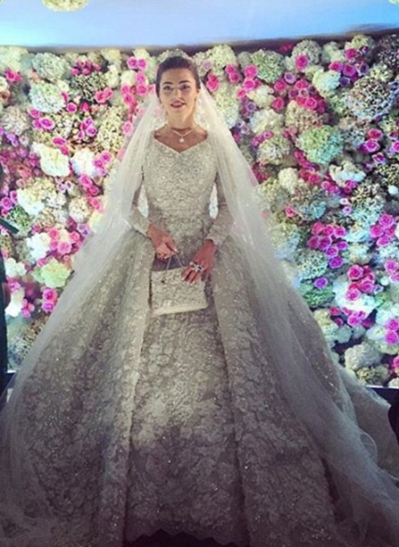 新娘薩拉梅伊頭飾上鑲滿了鑽石,脖子上還戴著巨大的鑽石吊墜,穿得某奢侈品牌禮服成本近17萬人民幣,與其相配的手包都是從巴黎購買的。禮服上鑲滿了各種飾品,重量超過11公斤,需要多人幫助托扶。