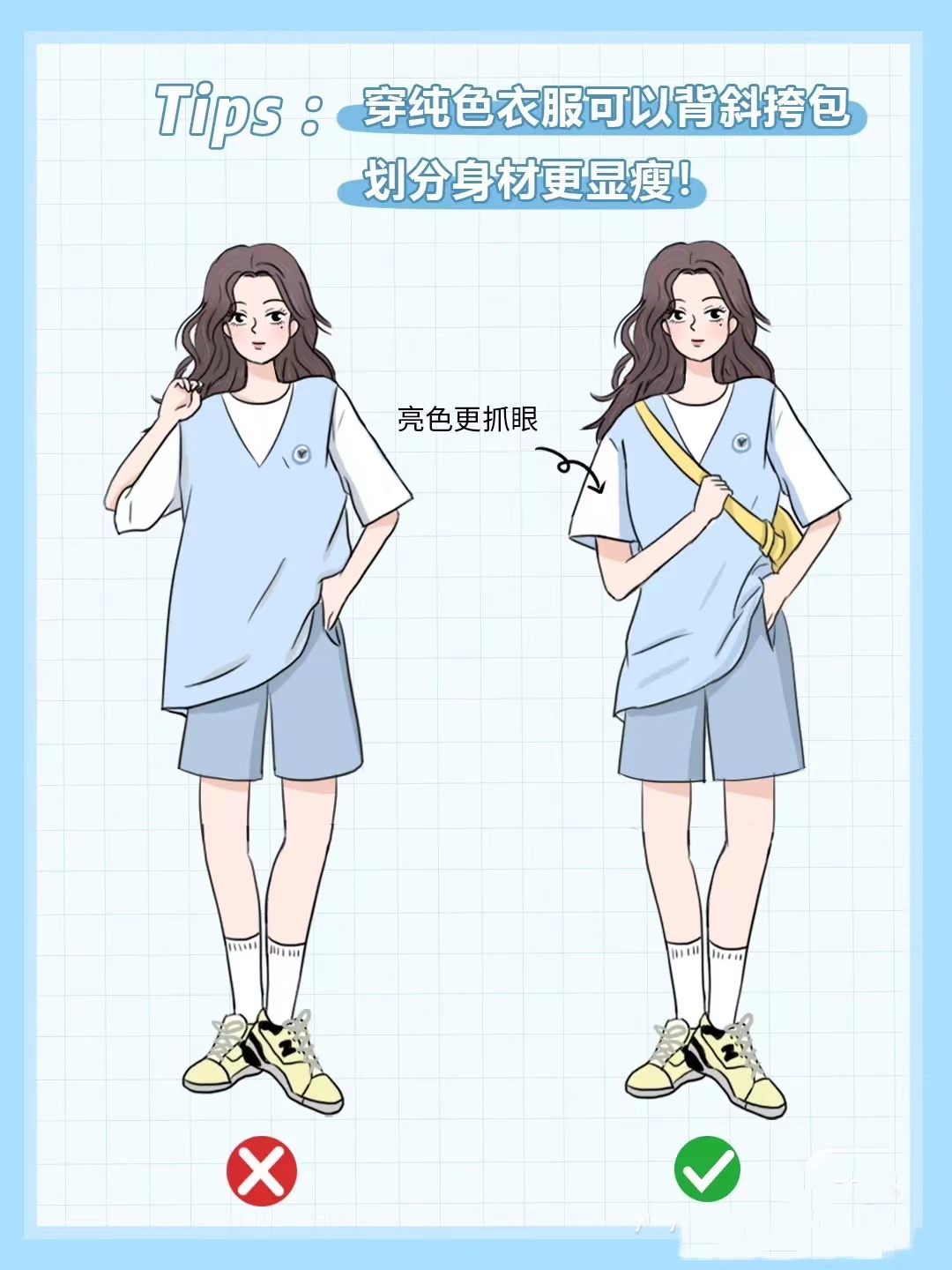 當我們穿著寬鬆的純色衣服時,很容易有一種慵懶感,也會橫向拉寬身材比例,顯得整個人的身材更加壯碩。這時候如果搭配斜挎的背包,就可以更好地優化身材,利用對角線的比例,打造出更加時尚的氣息,顯得身材比例更加出眾。