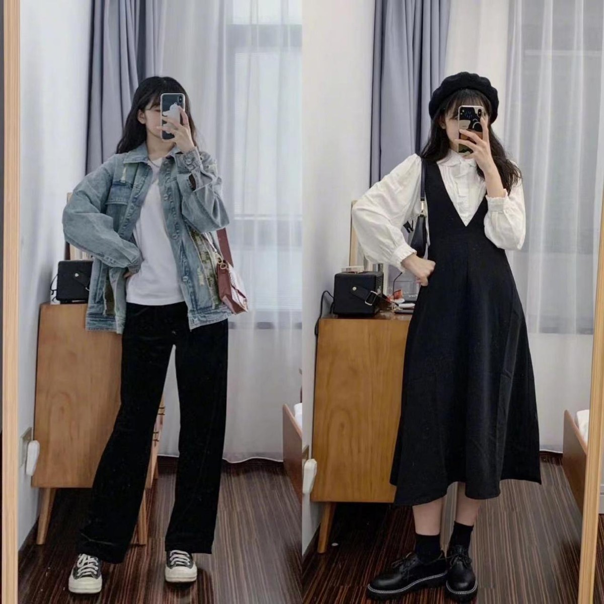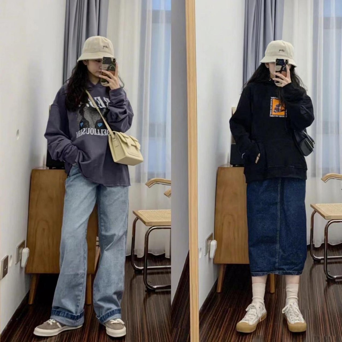 黑色的牛仔闊腿褲也是很日常百搭的,而且可以搭配黑色的衛衣,簡約的同色系穿搭。雖然沒有那麼亮眼,但是卻富有自己的個性,是獨特的,又很自然地穿出了日常生活中的姿態。