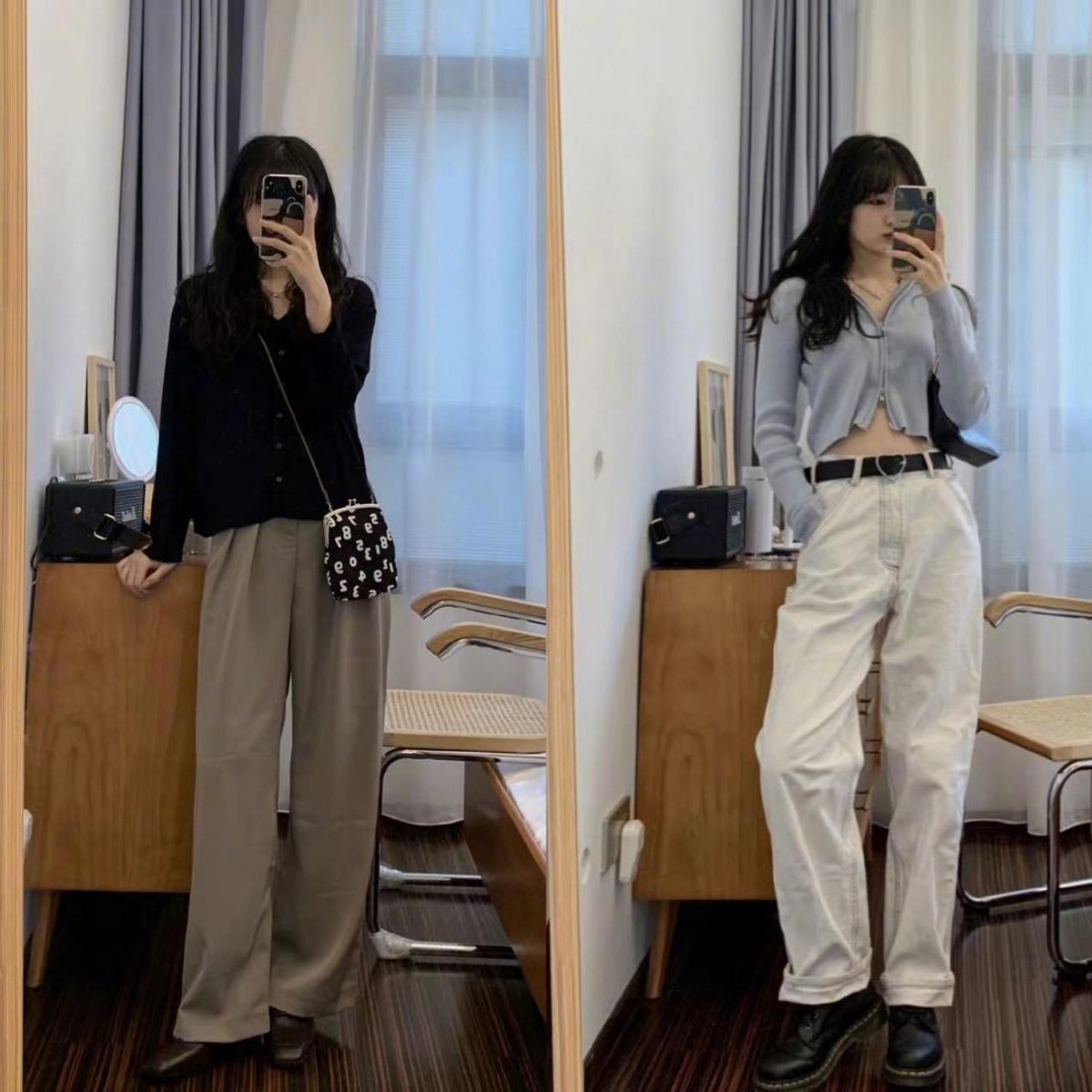 淺藍色的闊腿褲亦是日常簡約風,但它本身也是非常復古的褲裝單品,寬鬆的闊腿褲也讓很多微胖女生可以放心地選擇和搭配,因為闊腿褲不顯腿型,誰都可以穿出高高瘦瘦的樣子。