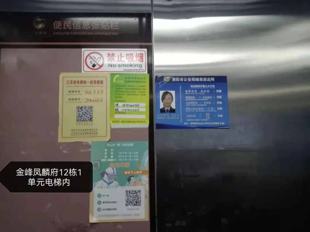▲受害人所在小區單元門、電梯防詐騙宣傳張貼處