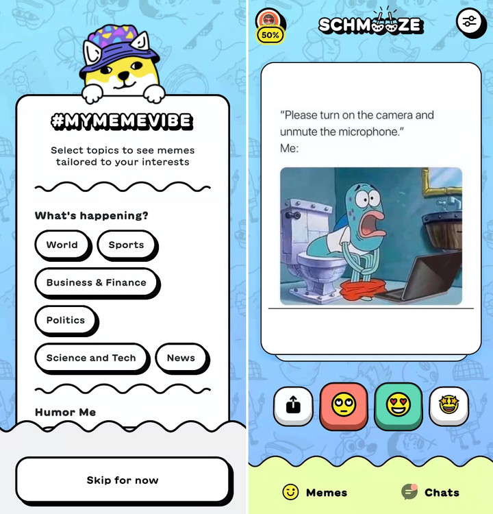 你可以把 Schmooze 稱為搞笑版 Tinder,它是一款基於 meme(迷因)的約會交友 app。在這裡,你左劃右劃的不是好看皮囊,而是一個接一個的梗圖表情包。