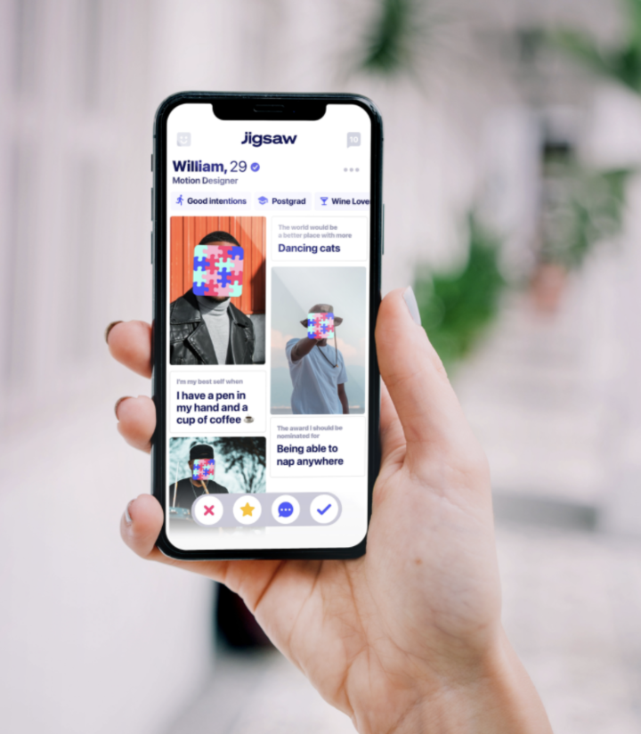 ▲ 一款叫 Jigsaw 的約會產品,所有用戶的臉都會先打上拼圖,隨著聊天再慢慢解鎖