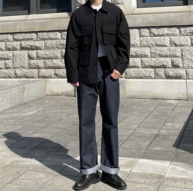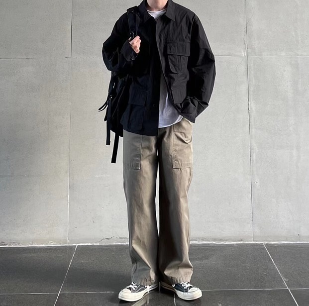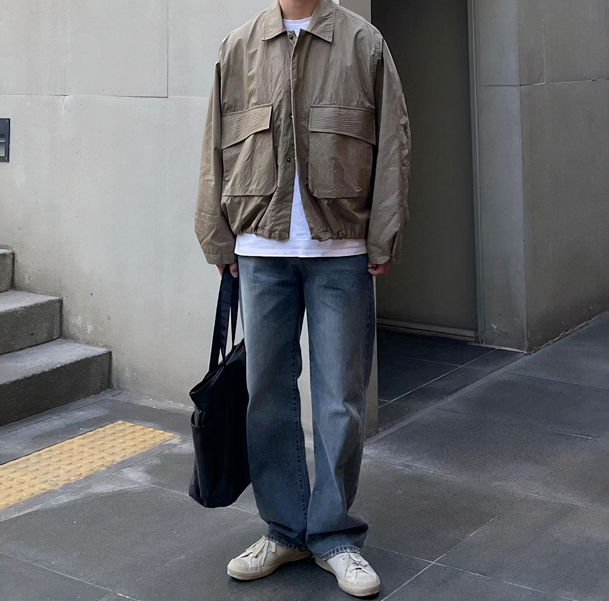 基礎基礎的工裝外套,簡單又有層次,內搭T恤還是襯衫都皆宜。版型直筒輕鬆也很好駕馭起來。褲裝選擇一條淺色牛仔闊腿褲,不挑身材,簡單穿出時髦感。