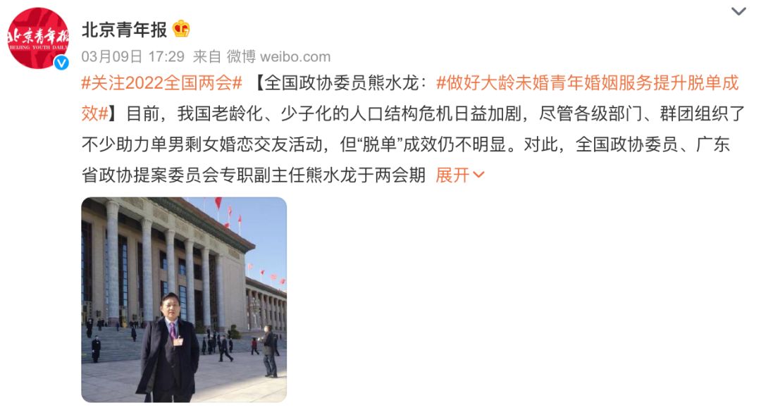 例如,全國政協委員、廣東省政協提案委員會專職副主任熊水龍於兩會期間提交《關於加強大齡未婚人員婚戀服務工作力度的建議》的提案: