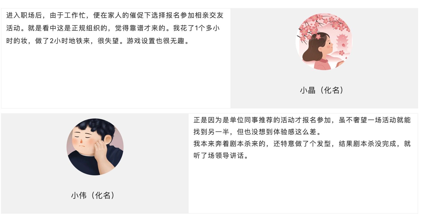 此前,某單位組織的一項以劇本殺為主題的相親交友活動,場面極度尷尬,參加活動的青年人更是發出「白做了2小時捷運」的評價。