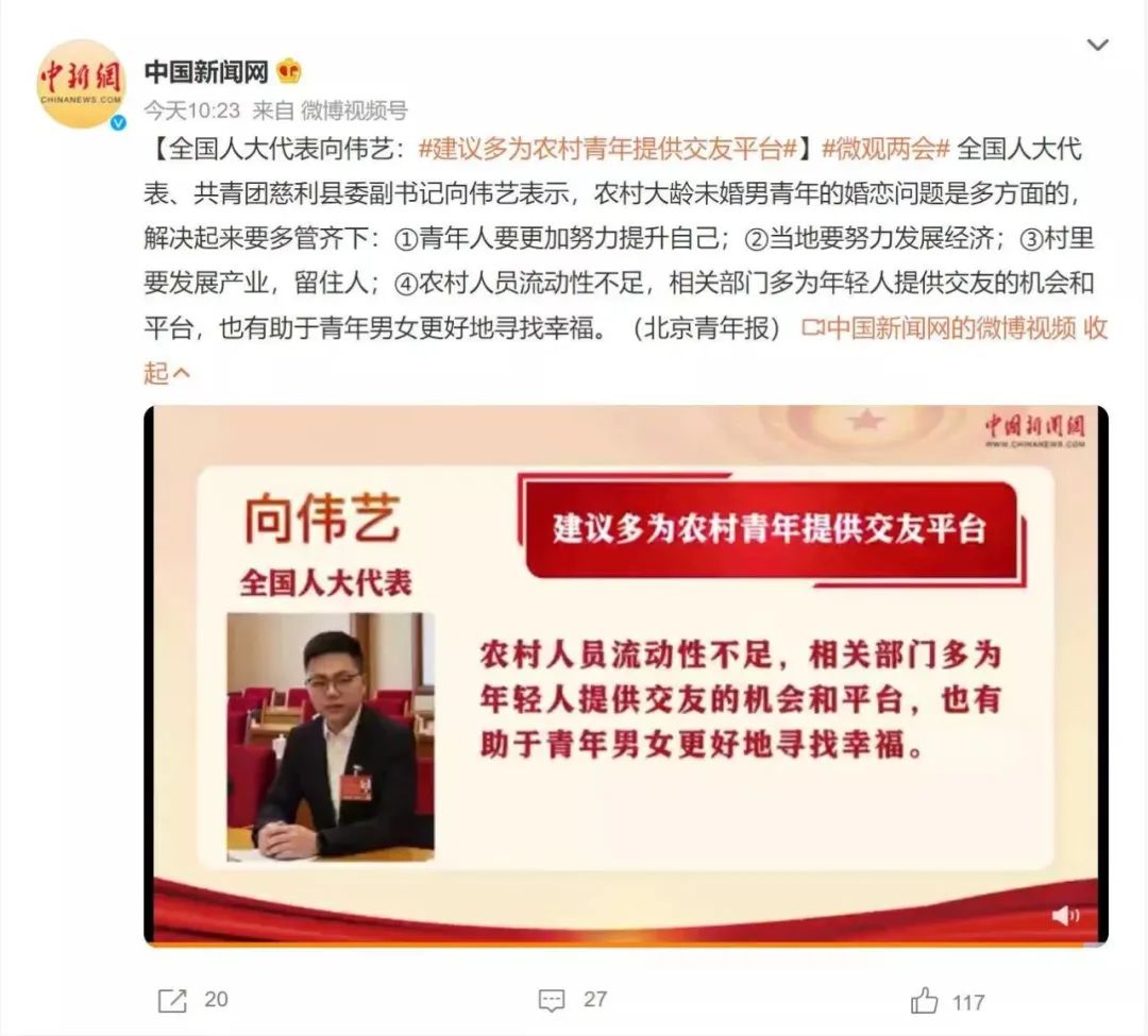 再如,全國人大代表、共青團慈利縣委副書記向偉藝關註農村大齡未婚男青年的婚戀問題: