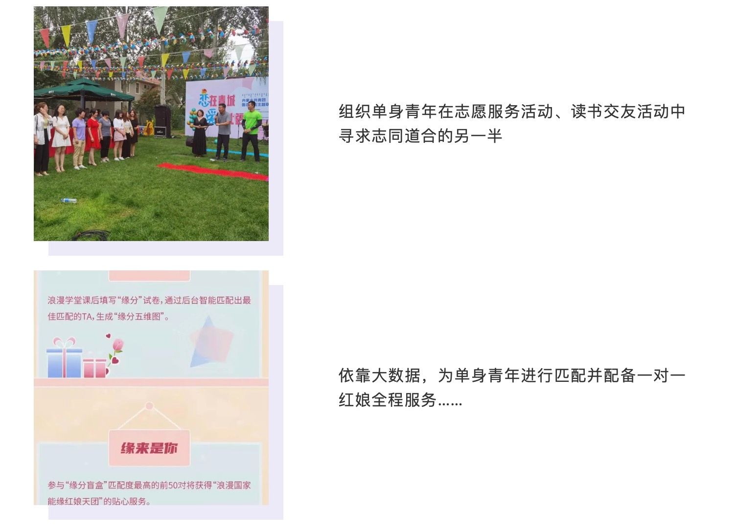 相親聯誼交友活動是促成戀愛的一種渠道,也是相關單位組織做好青年婚戀服務的前端。比起戀愛教學、親密關係維護、婚姻關係維穩修復等服務,讓單身青年彼此接觸認識是第一步。