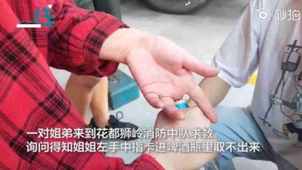 據悉,事情發生在9月7日,這天,廣州花都獅嶺消防中隊門口來了一對姐弟,他們是來向消防員們求助的。消防員經過詢問得知,姐姐左手中指卡進啤酒瓶裡取不出來。不僅如此,女孩的中指上還戴著一枚戒指,給救援增加了難度。