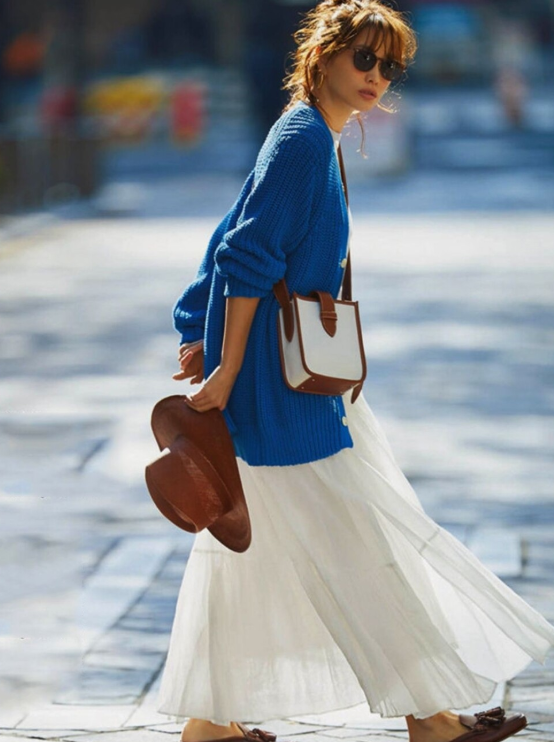 還有一些人會用各種不同色彩的服飾來混搭,提升時尚感,你也可以學習下面的博主,選擇藍色的毛衣,結合白色裙裝之後更加輕盈,毫不費力地就能凸顯出溫柔的魅力。再加上寬大的裙擺修飾雙腿,微胖mm也可以借鏡。