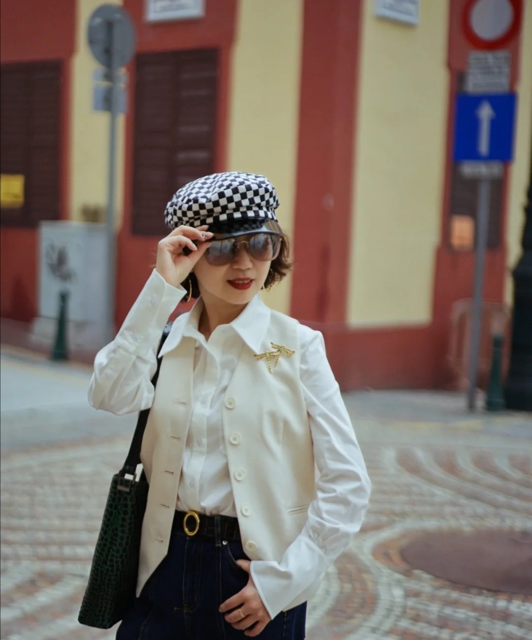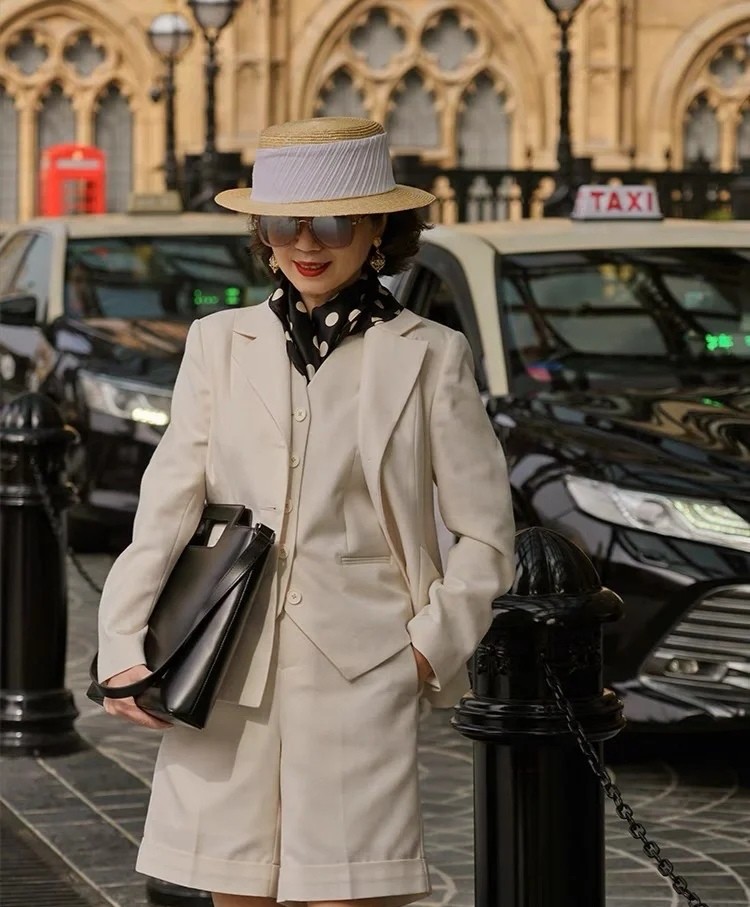 這件米色的小西裝,先用西裝馬甲進行疊加,體現正式感,但同色短褲的存在,卻又大大地削弱了正式的氣息,呈現出時尚灑脫的風韻。頸部佩戴黑色的波點絲巾,有點復古的情調。