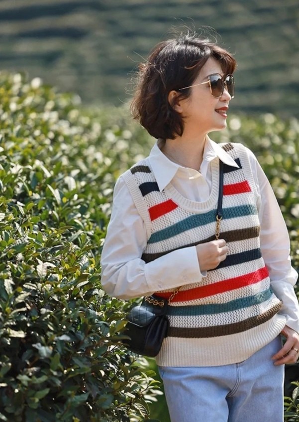 這件條紋針織馬甲,它可以形成減齡的效果,顏色豐富,但絕對不會顯得繁雜不堪。裡面疊加一件白色T恤,這種穿衣方式可以打破原本襯衫的單一感。