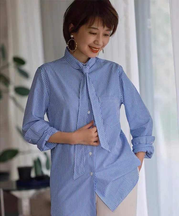 例如這件條紋襯衫,它有兩款最清爽的色彩,白色和藍色一直都是沒有年齡限制的色系,組合在一起,將清爽指數提升很多。這種襯衫可以打造出多種風格,下擺雖長,但可以塞入到下半身的單品之中,也可以把它散落下來,更加大方。