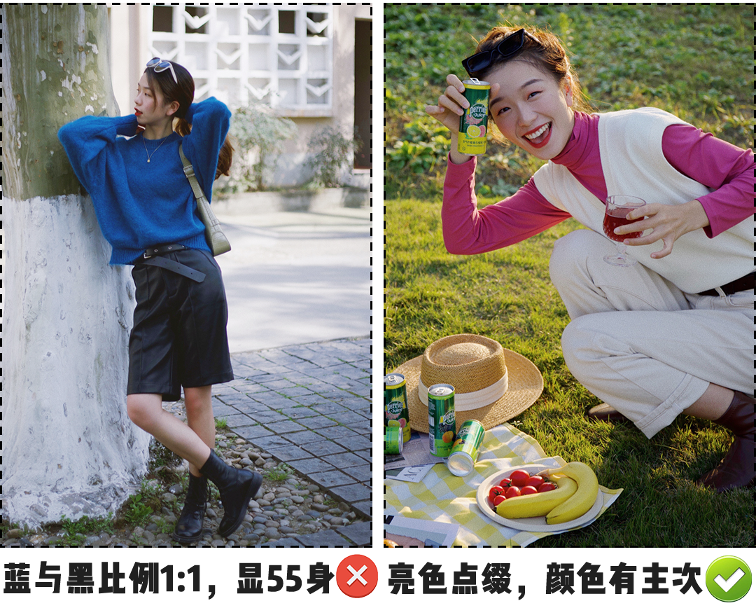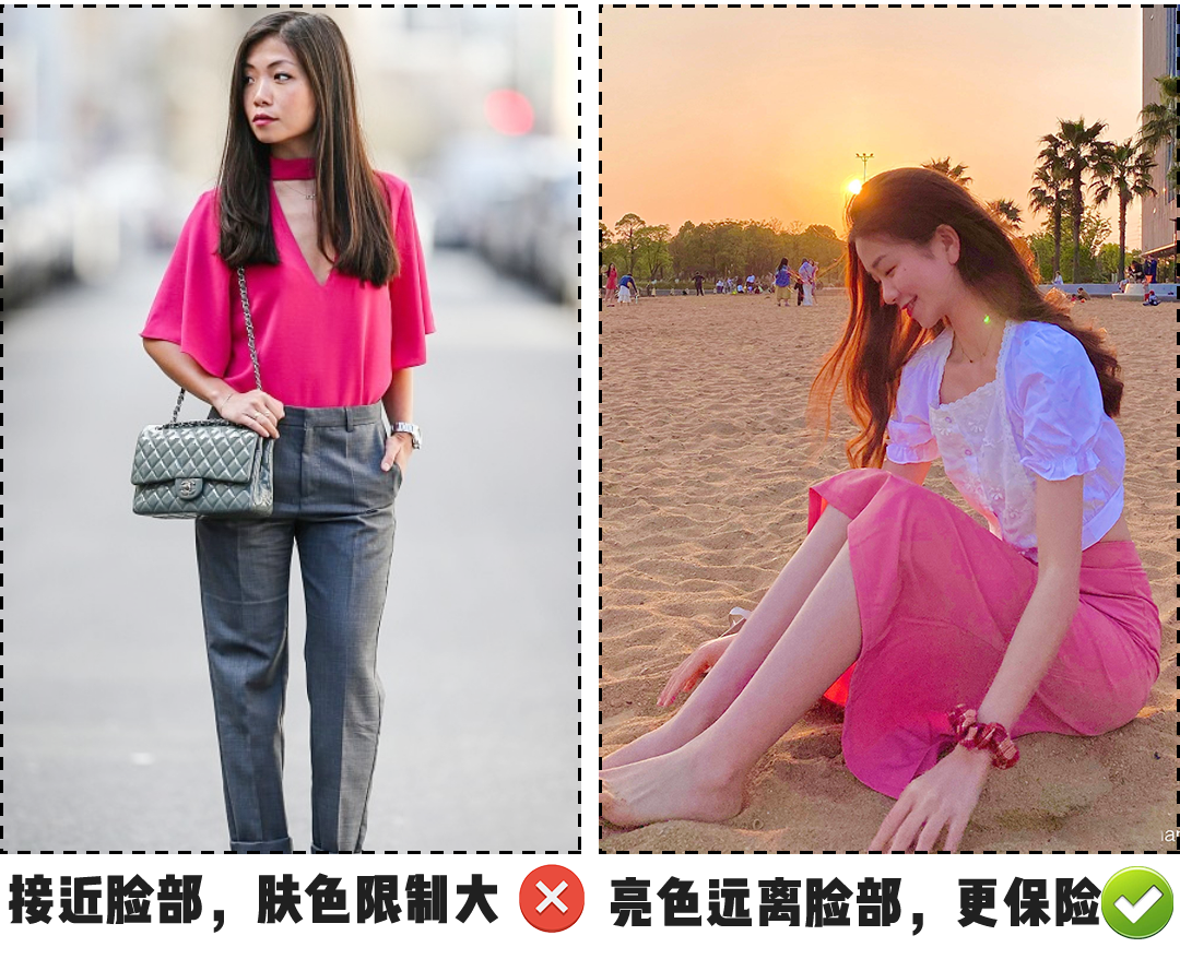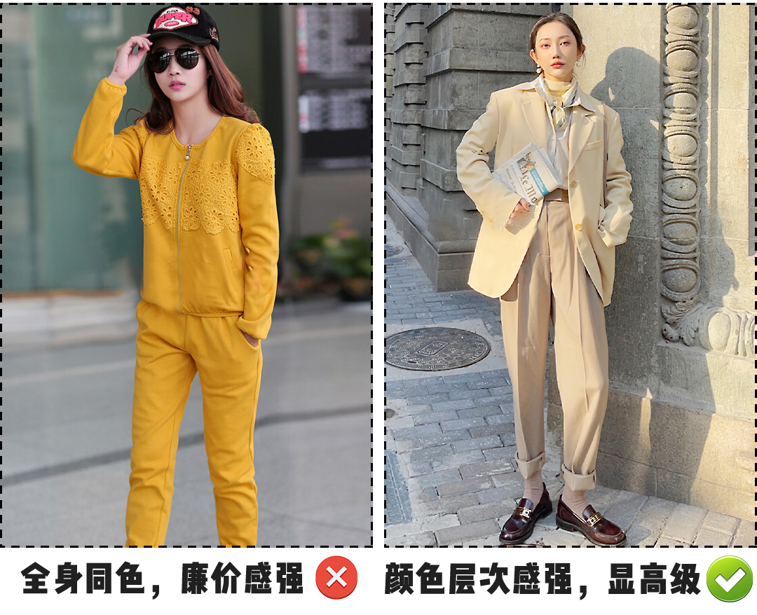 所以,如果是穿搭功力一般的普通女生,想要通過色彩搭配,穿出亮眼的效果,一定要注意下面兩點。