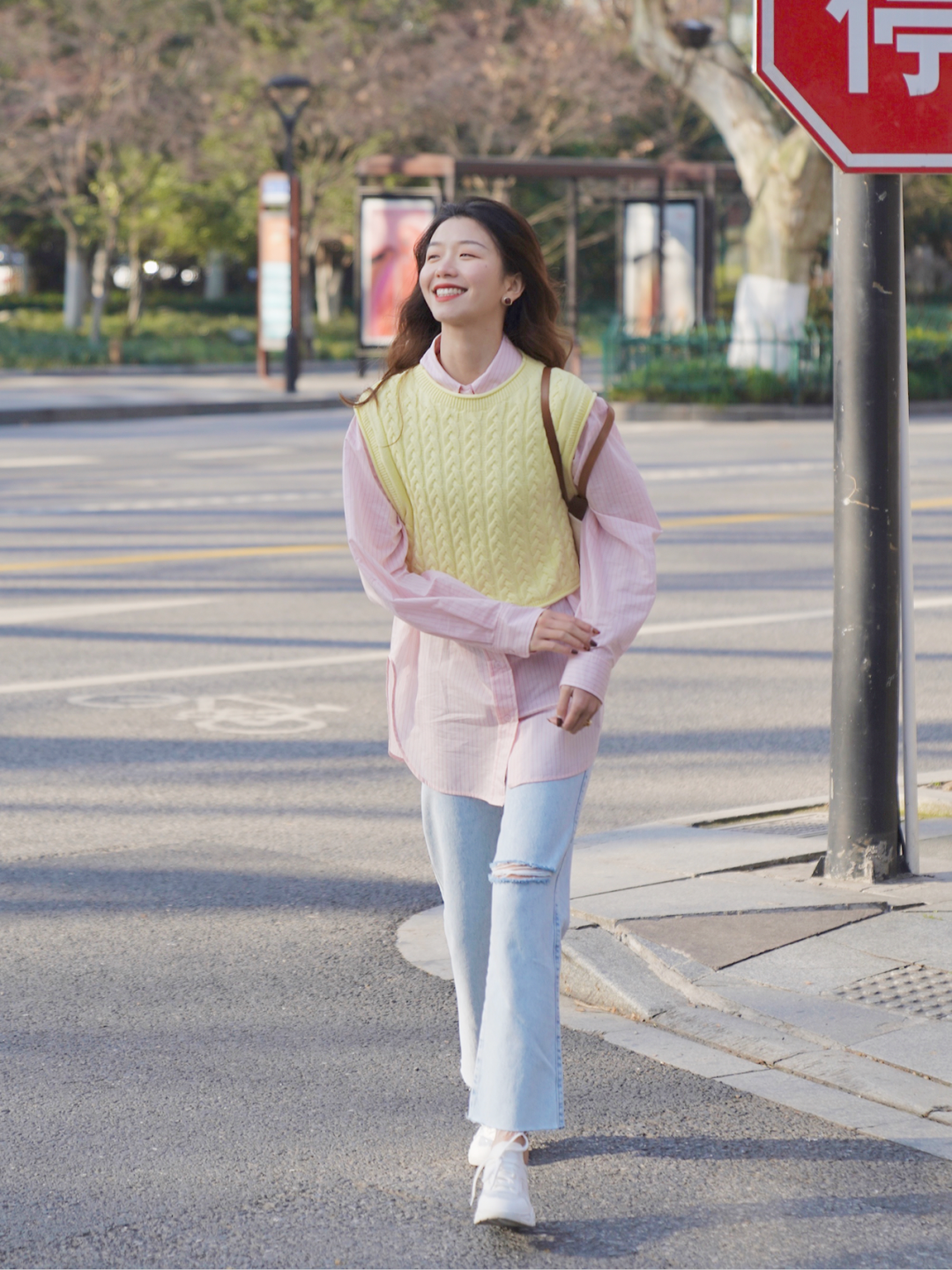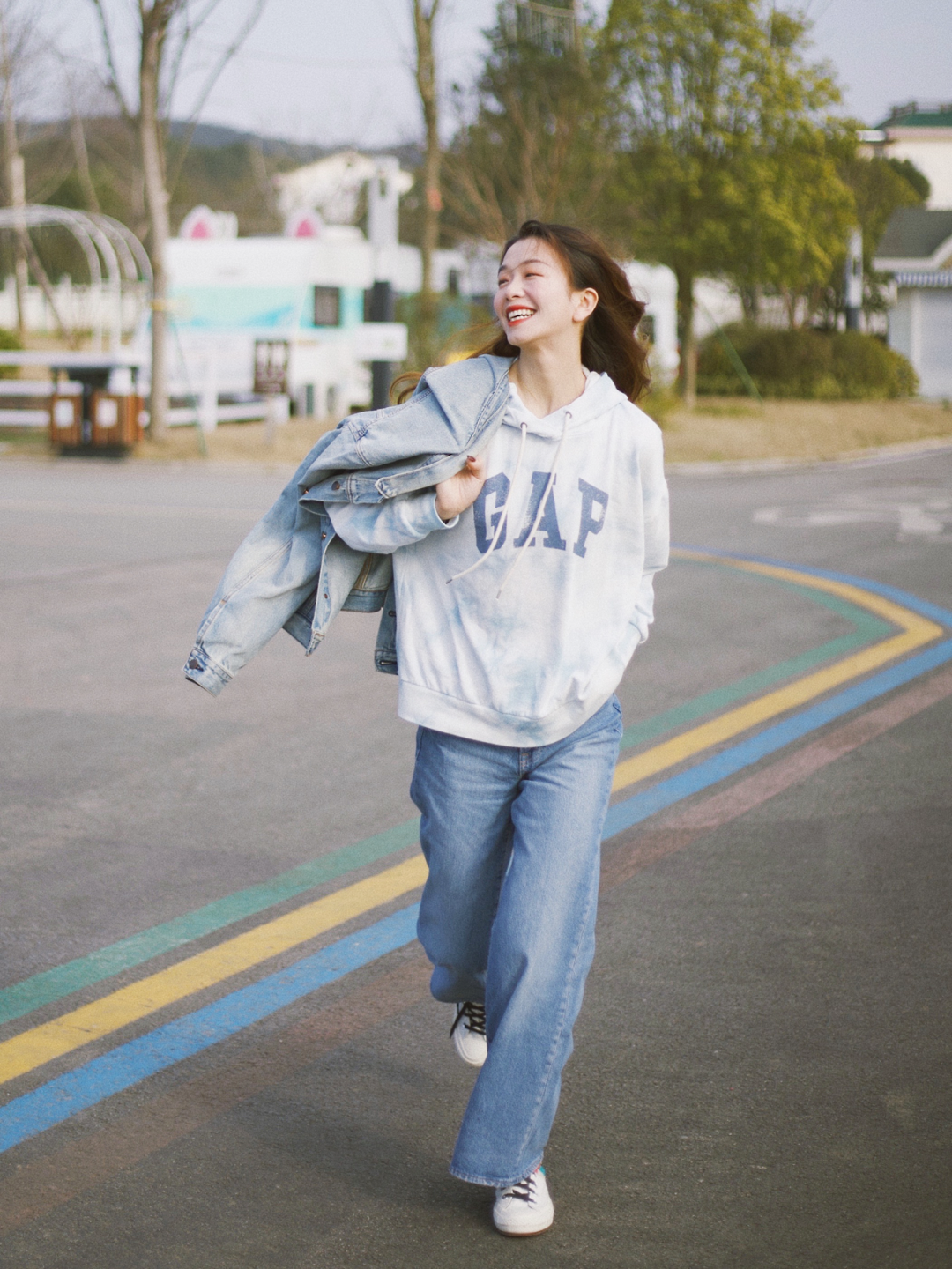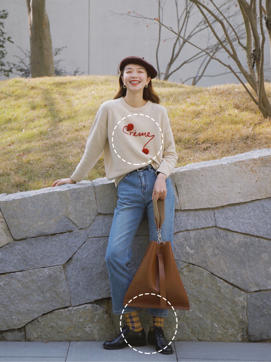 雖然針織毛衣、牛仔褲同色但絲毫不顯單調,毛衣自帶的溫柔氣質平衡了牛仔的硬氣,讓視覺也更加地舒服。