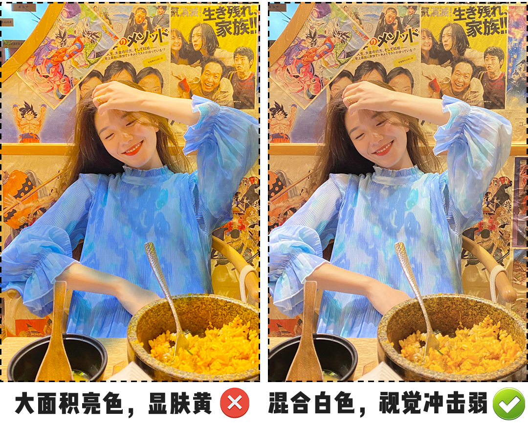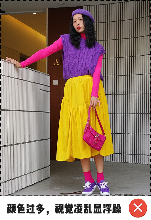 很多女生會盲目地追求色彩碰撞,結果效果卻適得其反,太多跳躍的顏色視覺上凌亂又刺眼。