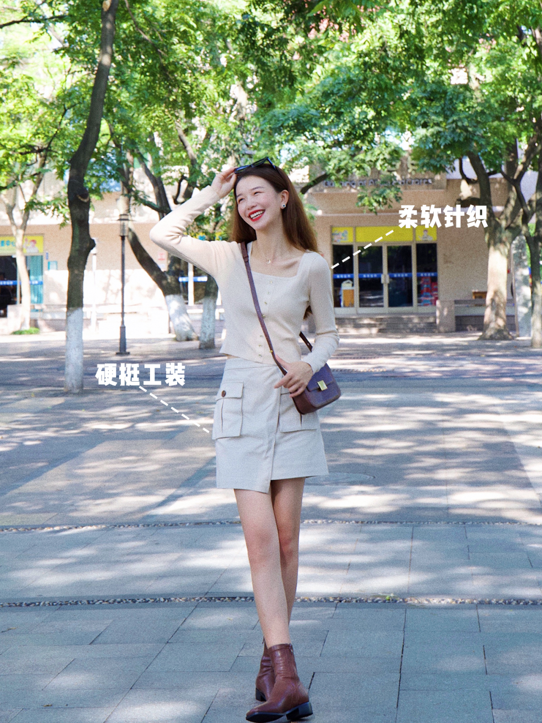 即使顏色完全一致,偏女性氣質的針織面料和中性化的工裝相碰撞,整體看起來也不乏層次感。