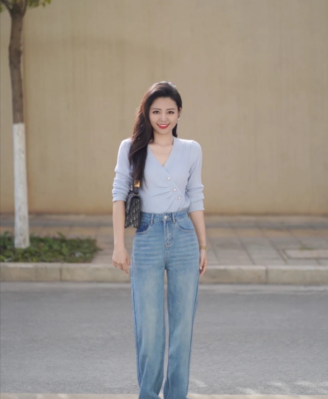 身高並不是特別出眾的女性,肯定希望借助一些單品美化曲線,就能採用短款上衣和牛仔褲的配合。質感良好的淺藍色針織上衣,結合顏色清爽的褲裝,高級又簡約。