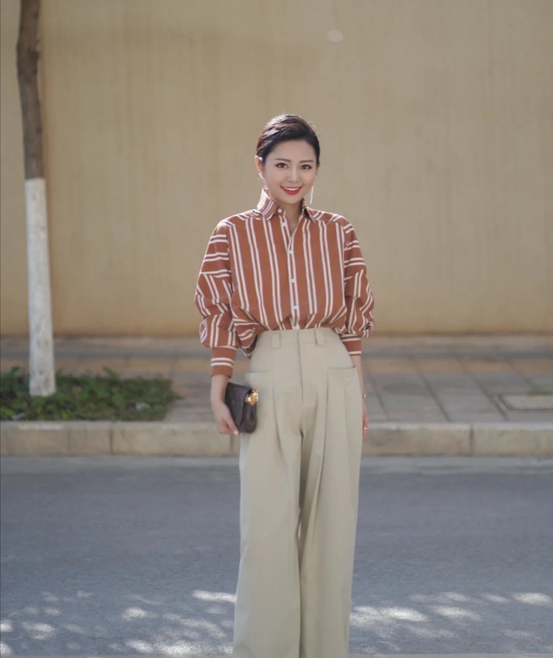 襯衫不一定總是要採取純色的類型,豎條紋單品也可以營造出時髦效果。像這款襯衫,它的色澤選用不壓抑,條紋的延伸感也明顯,可以帶來對身材的修飾作用。而這裡採用的穿衣公式叫「襯衫+長褲」,放大利落感,減重作用更顯著。