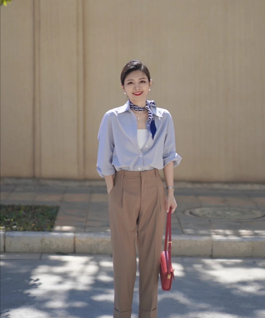 藍色襯衫並不是一款不好掌控的存在,相反,它和白色襯衫一樣百搭。這位靠穿搭圈粉的博主在裡面疊加了一件低領衫,可以把紐扣解開,這樣的穿搭不至於死板或者太拘謹。內搭的選用很簡潔,甚至有點平淡,加上裸露出來的頸部肌膚較多,顯得空蕩,配合絲巾再巧妙不過。