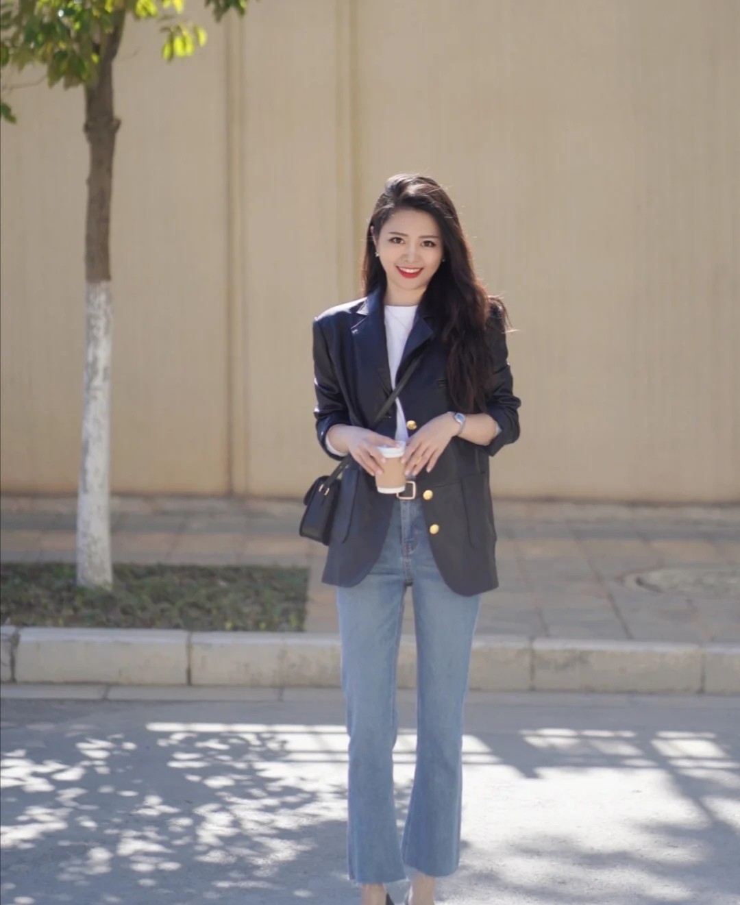 如今的職場穿搭早已形成了多元化的模式,不一定只有採取西裝和西裝褲的組合才是唯一的方案。藍色牛仔褲也能讓女性的著裝很得體,很大方。
