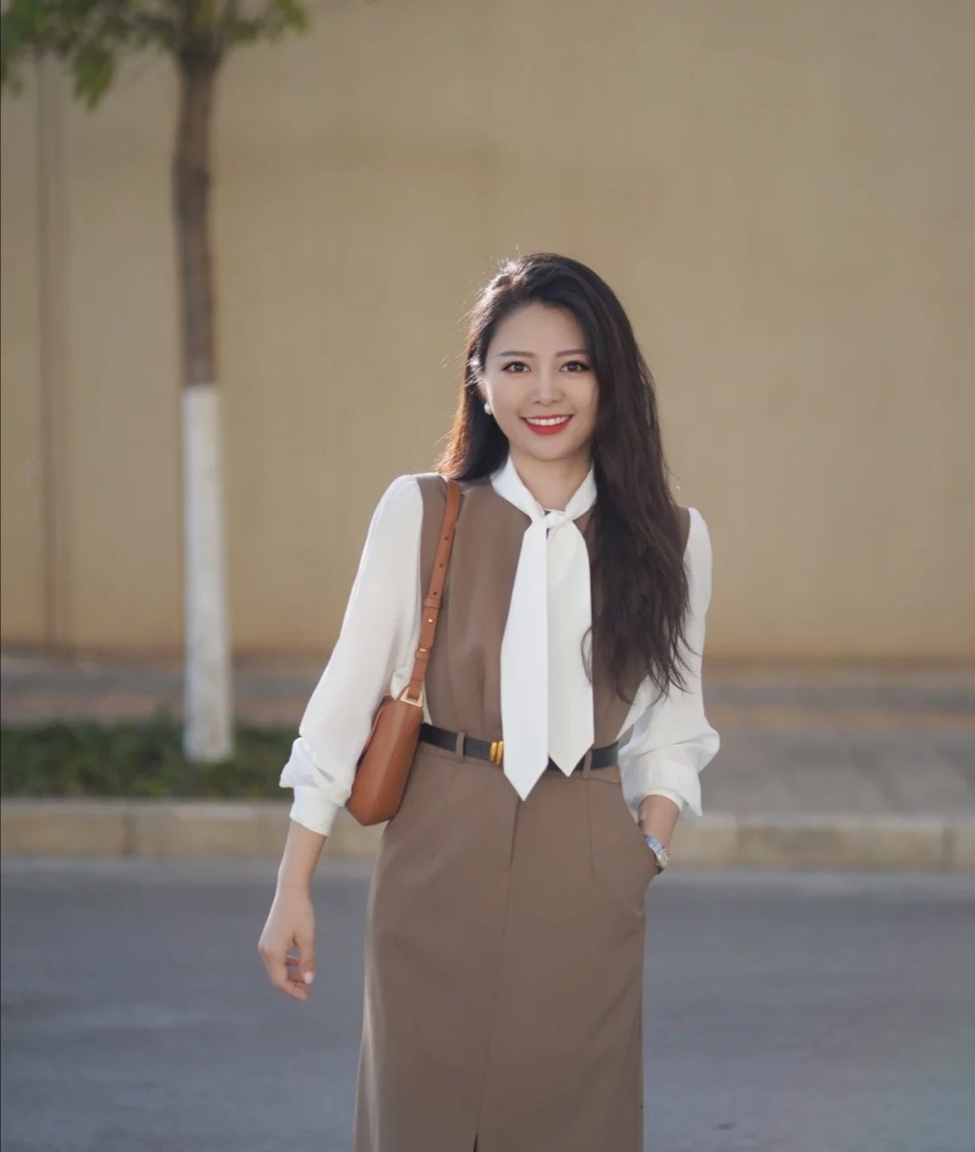 上班族可以採取一款馬甲裙和飄帶襯衫的組合,但顏色的選用最好都是純色。大地色的馬甲,在彰顯穩重架式的同時,不會放大年齡感或帶來老氣感,讓駕馭者美得更知性。