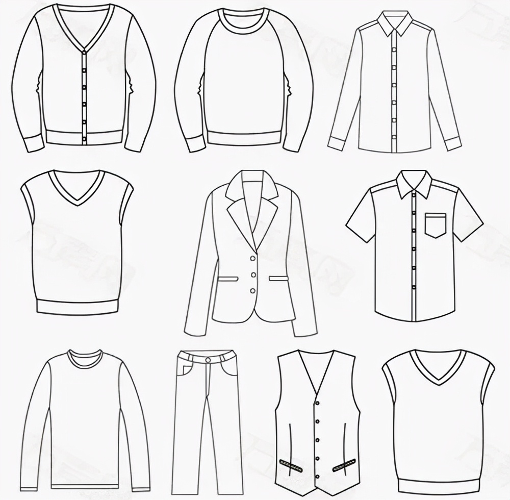 從線條入手,衣服通常有3種線條:輪廓線、衣片線(對接線)、裝飾線組成。款式越基本,線條就越少。