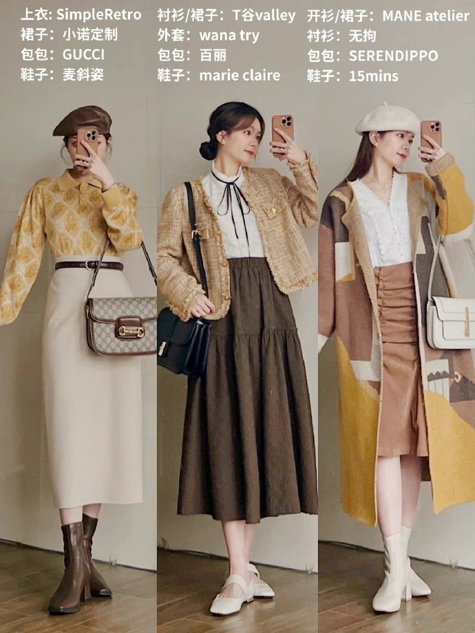 這款黃白格紋拼色針織燈籠袖上衣配上白色高腰半身裙,形成了復古又有精緻氣息的時裝搭配,另一套組合當中選擇了復古的黃色毛呢小香風外套,配上深棕色高腰半身裙,造型精緻又很大氣。
