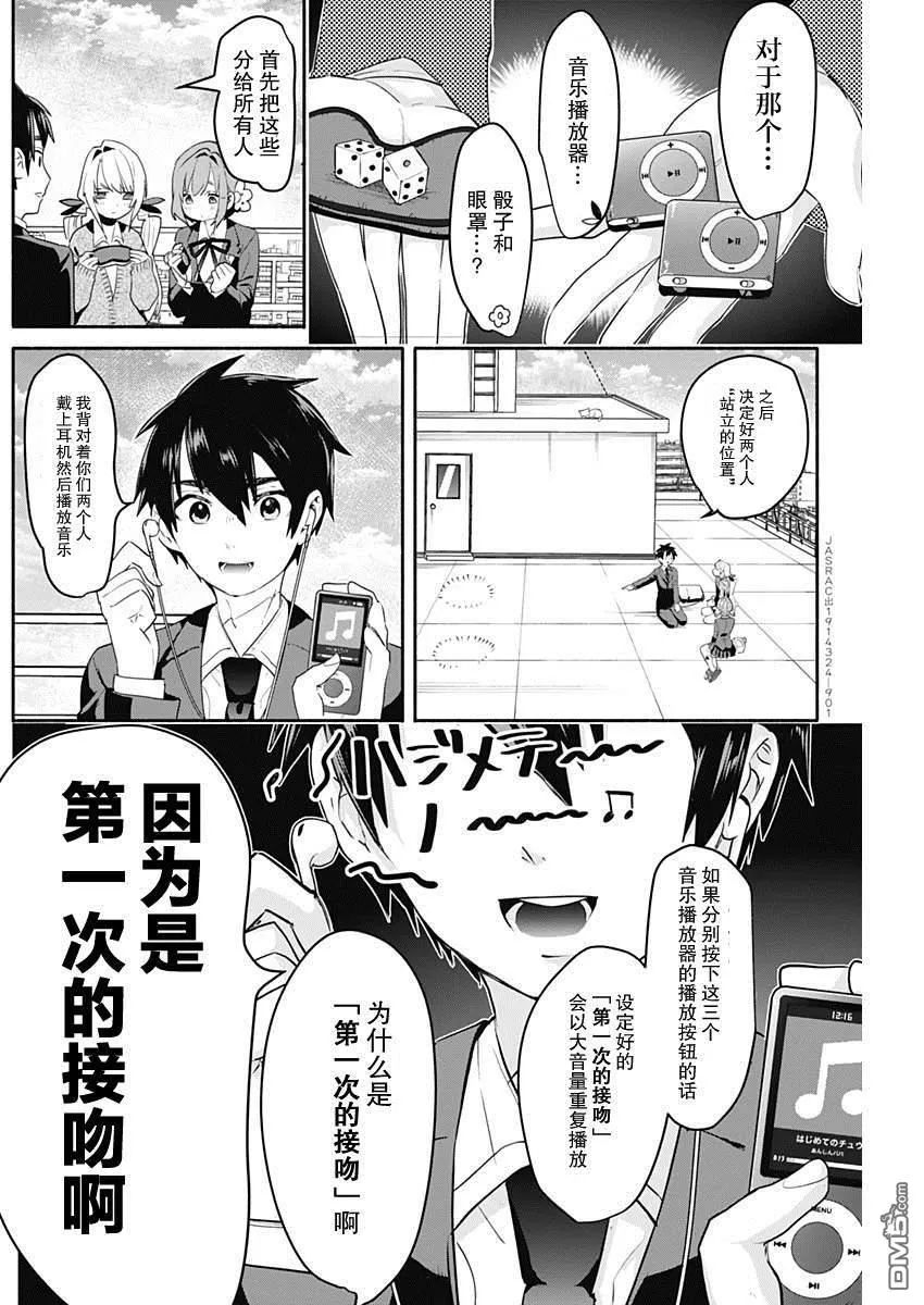 首先是兩個女孩用骰子比大小,數字大的站在右邊,數字小的站在左邊,然後帶上眼罩,靜待親吻。用這種方式,隨機分配了兩個女孩的位置,除了她們自己,戀太郎是不知道她們的位置的。